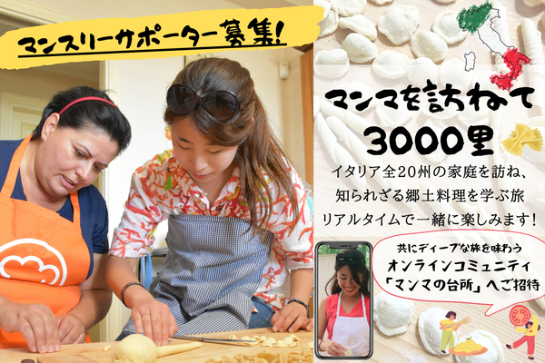 イタリア留学中の2年間、イタリア全20州の小さな村の家庭を訪ね、マンマ(イタリア語で’お母さん’)から料理と伝統を学ぶ旅に出ます。学んだディープな食を、写真や動画のレシピと共に、日本の皆さまに届けます。前代未聞の大冒険、マンスリーサポーター大募集!最高にエキサイティングな旅を一緒に楽しみませんか?