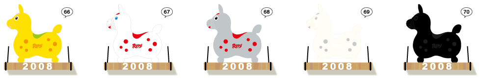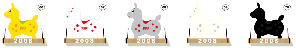 ▼ その後、赤色に続き黄色と青色が増えました。それら三原色は子供の注意をひく主要な色だからです。今では定番色は10色に増え子供の乗用玩具という用途だけではなくインテリア雑貨として子供たちにだけでなく大人たちにも愛されています。