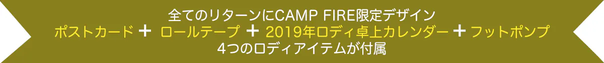 全てのリターン(乗用ロディを含むリターン)にはCAMP FIRE限定デザインのロディアイテムが付属いたします。