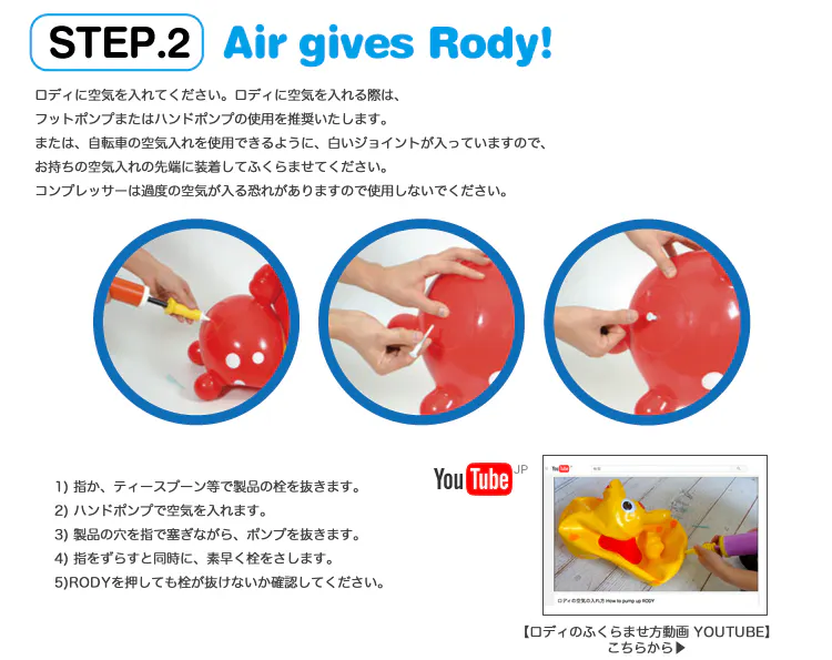 セットの空気いれや、浮き輪などを膨らます空気入れで、ロディを膨らませてから遊びます。