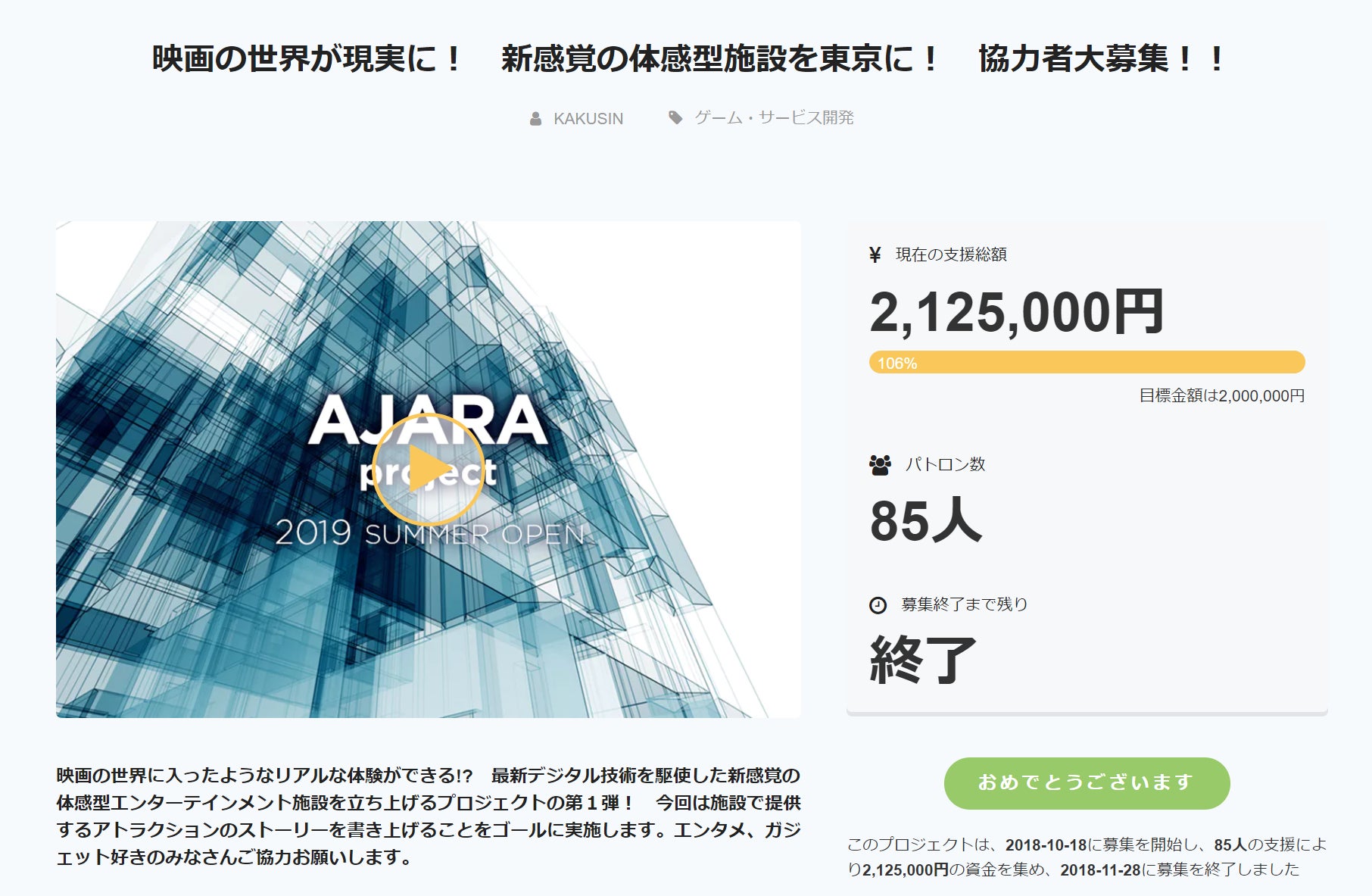 2018/11/29 10:57こんにちは、プロジェクトマネージャーの大倉です。この度は『AJARA Project』第1期のクラウドファンディングをご支援いただきありがとうございました!みなさまの温かい支援のおかげで、総額2,125,000円(達成率106%)無事、目標金額を達成することができました。ご支援ならびにSNSでの拡散など応援いただいたみなさまに重ねて御礼を申し上げます。ご支援いただいたみなさまへのリターンのお届けは2019年1月末を予定していますので、楽しみにお待ちいただければと思います。引き続き『AJARA Project』メンバー一同、みなさまにお届けするリターンの制作や施設の立ち上げにむけての準備を進めてまります。その様子は活動報告や公式Twitterなどを通じて定期的にお知らせさせていただきます。公式Twitterフォローいただけるとうれしいです。■『AJARA Project』公式Twitterhttps://twitter.com/AJARA_Project施設の立ち上げに向けて、スタッフ一同、力をあわせてがんばりますので、これからもどうぞよろしくお願いします。■『AJARA Project』クラウドファンディングページhttps://camp-fire.jp/projects/view/100231 もっと見る