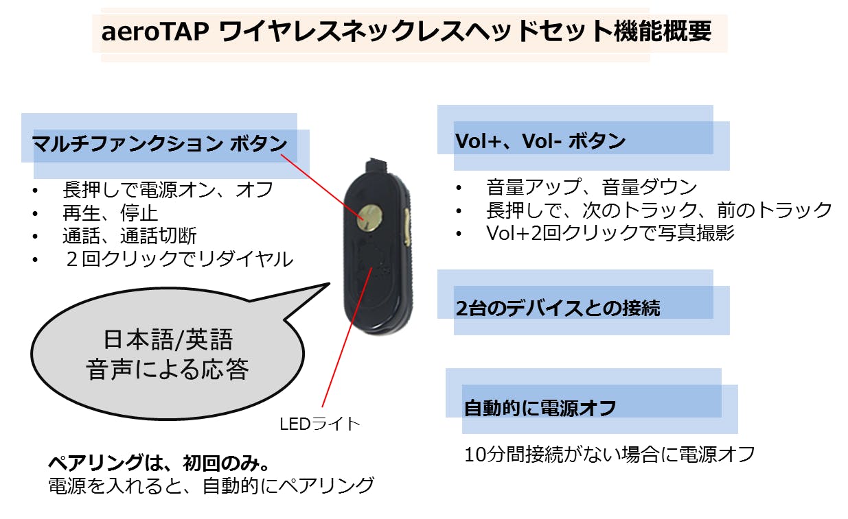 あれから1年、使い易さが大好評のaeroTAPワイヤレスネックレスヘッドセットの改良版の生産を始めることになりました。軽量設計を維持しながら本体ヘッド部分のデザインをクリップ型に変更して、ぶらぶらを解消、固定できるようにしました。日本発の弊社オリジナルデザイン(意匠登録済み)です。