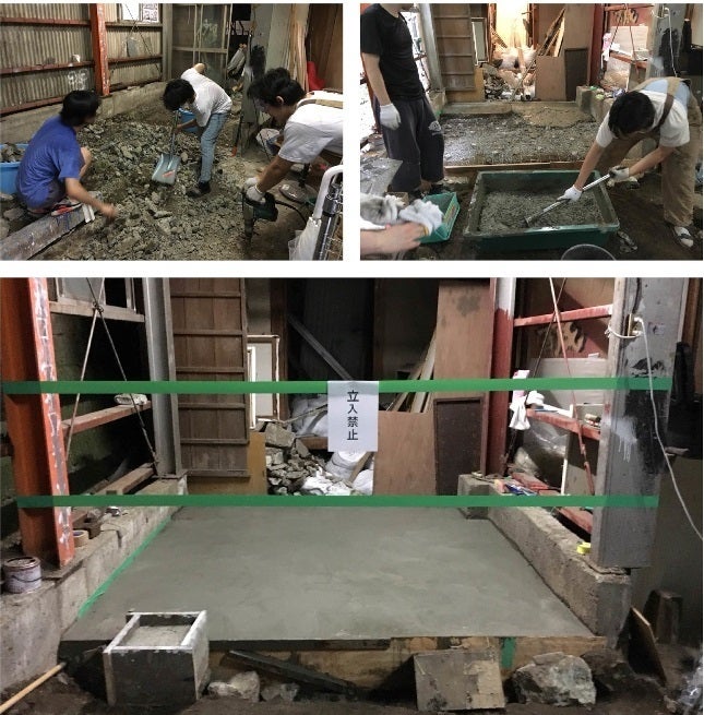 土間の新設/トタンの張り替え/鉄骨の塗装/コンクリートブロック壁の塗装/レール照明の設置/造作家具の作成/プロジェクターの設置/間仕切りカーテンの設置/鉄骨はしごの作成・発注/縁側の作成//既存家具の解体/コンクリート瓦礫の撤去/廃木材の撤去/アルミ戸ガラス戸の撤去/など部分的なDIY改修を行い、製作が行いやすい環境を整備します。