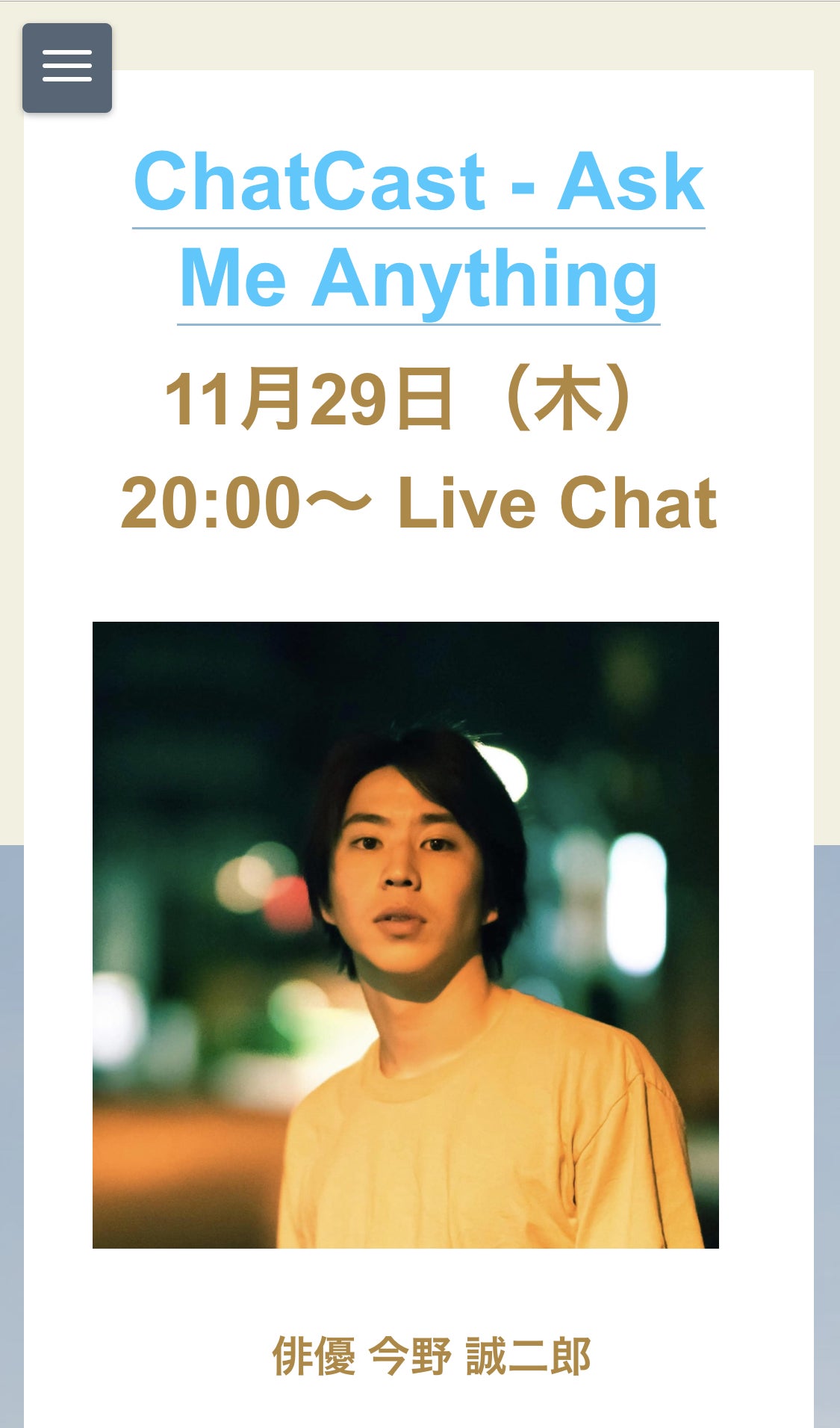 2018/11/29 10:51【本日20:00から!質問会をします!】本日の20:00から!F/Actory代表今野がChatCastにてチャットでの質問会を開催します!F/Actoryに関してでも、クラウドファンディングに関してでも、今野の俳優業に関してでもなんでも気軽に質問してください!!▼こちらで事前に質問受け付けてます!https://chatcast-schedule.ideakitt.com/1よろしくおねがいいたします! もっと見る