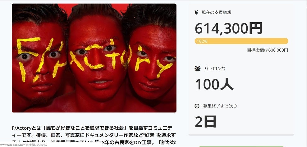 2018/11/29 14:52こんにちはF/Actory代表の今野誠二郎です。この度は本当に本当に本当に、ご支援ありがとうございました! 100人もの方々に支えられ、60万円という金額を達成することが出来ました。こんなにも多くの同年代が支援してくれて、運営陣一同感謝と驚きの雨に打たれております。(70代の方まで...ありがとうございます!!!)みなさまへのご恩を忘れずに、責任をもち、DIY工事と運営を行ってまいりますので、今後ともよろしくお願いします!そして!!クラウドファンディングの終了まであと2日となりました!!!皆様のおかげで目標の60万円は達成したのですが、自分たちが想定するものよりもはるかに進化させていきたいと思っています!どこよりも集中でき、どこよりも想像力が沸き立つような、”あなたが好きな自分でいられる場所”にするため、130%を目指して頑張りますので、ご協力のほど宜しくお願いいたします!!12月に入りましたら、順次Facebookグループへの招待、リターンの作成を行ってまいります!どうか引き続きF/Actoryを温かく見守ってください!!イベントやリターンに関して質問などございましたら、F/ActoryのTwitterかInstagramの方にご連絡いただけたらと思います!!本日20:00からChatCast(https://t.co/liPns7arZv)でも質問受け付けています!お気軽にぜひご参加ください!改修後のF/Actoryでお会いできるのを楽しみにしております!!F/Actory 今野誠二郎 もっと見る