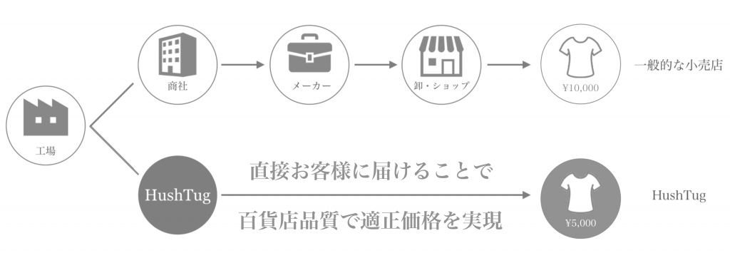 このようにHushTugでは中間マージンを省き、更にインターネットでの販売をメインとすることで大幅にコストを削減しています。これにより高級素材である本革を贅沢に使用したトートバッグでも1万円台で提供することが可能になっています。
