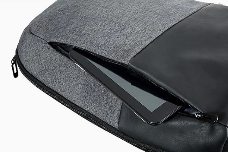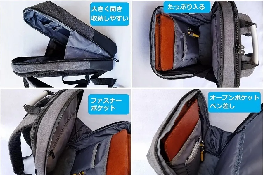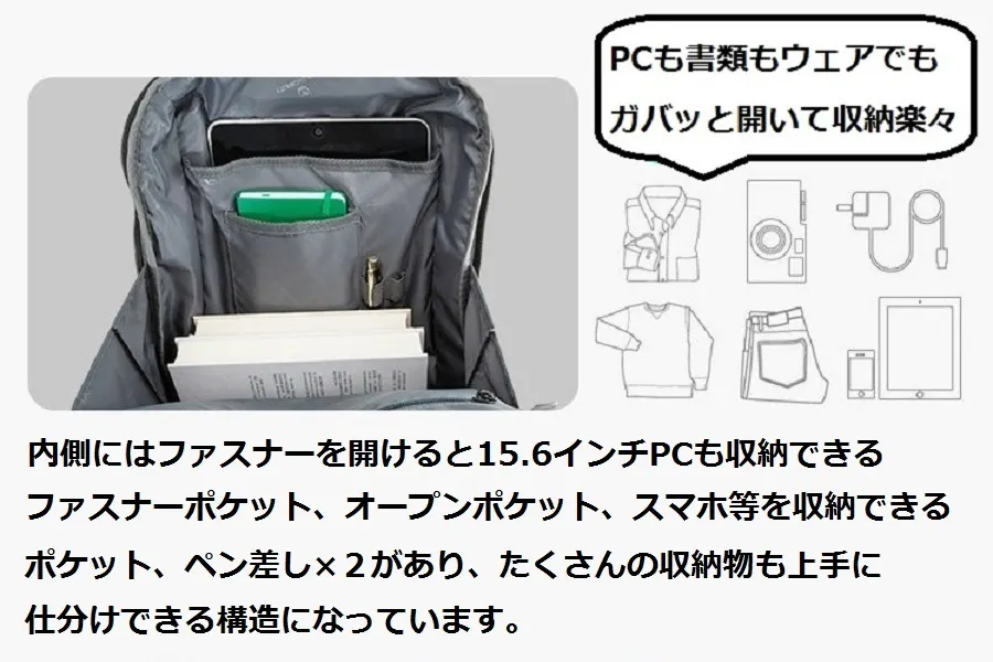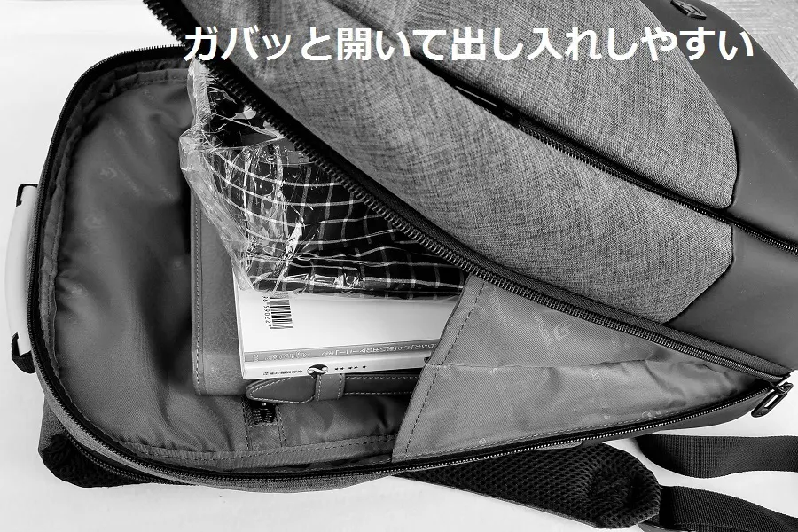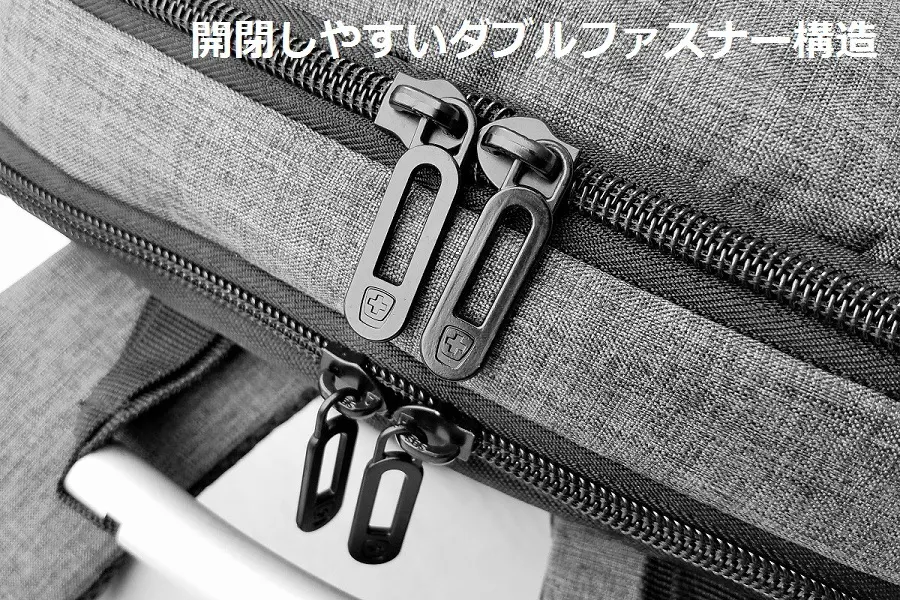 左右にある縦のラインで開閉するポケットは(約)開口部27cm×奥行20cmもあり、iPadAir等のタブレットもスッポリ入ります。左右が独立ポケットなので、収納物の仕分けができます。またシャープなイメージを醸し出す縦ラインのポケットですが、肩に掛けたままで出し入れしやすく、とても便利です。