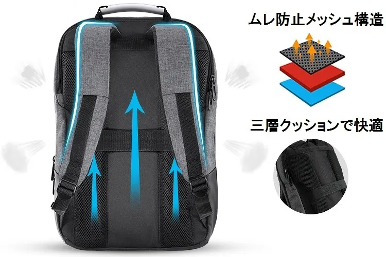本体及びショルダーベルト背面にある三層構造の通気性クッションがムレを防止。大容量タイプながらわずか780gの軽量設計でできていることと、高いクッション性が長時間使用でも疲れにくい快適構造。