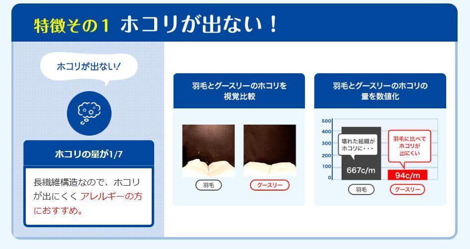 第三者公的機関でグースリー枕と羽毛まくらのホコリの出る量を分析してもらいました。