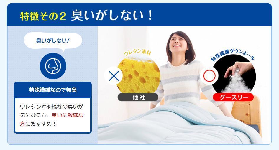 羽毛枕から臭う動物由来の独特な臭いに敏感な方にはグースリー枕がおススメです。