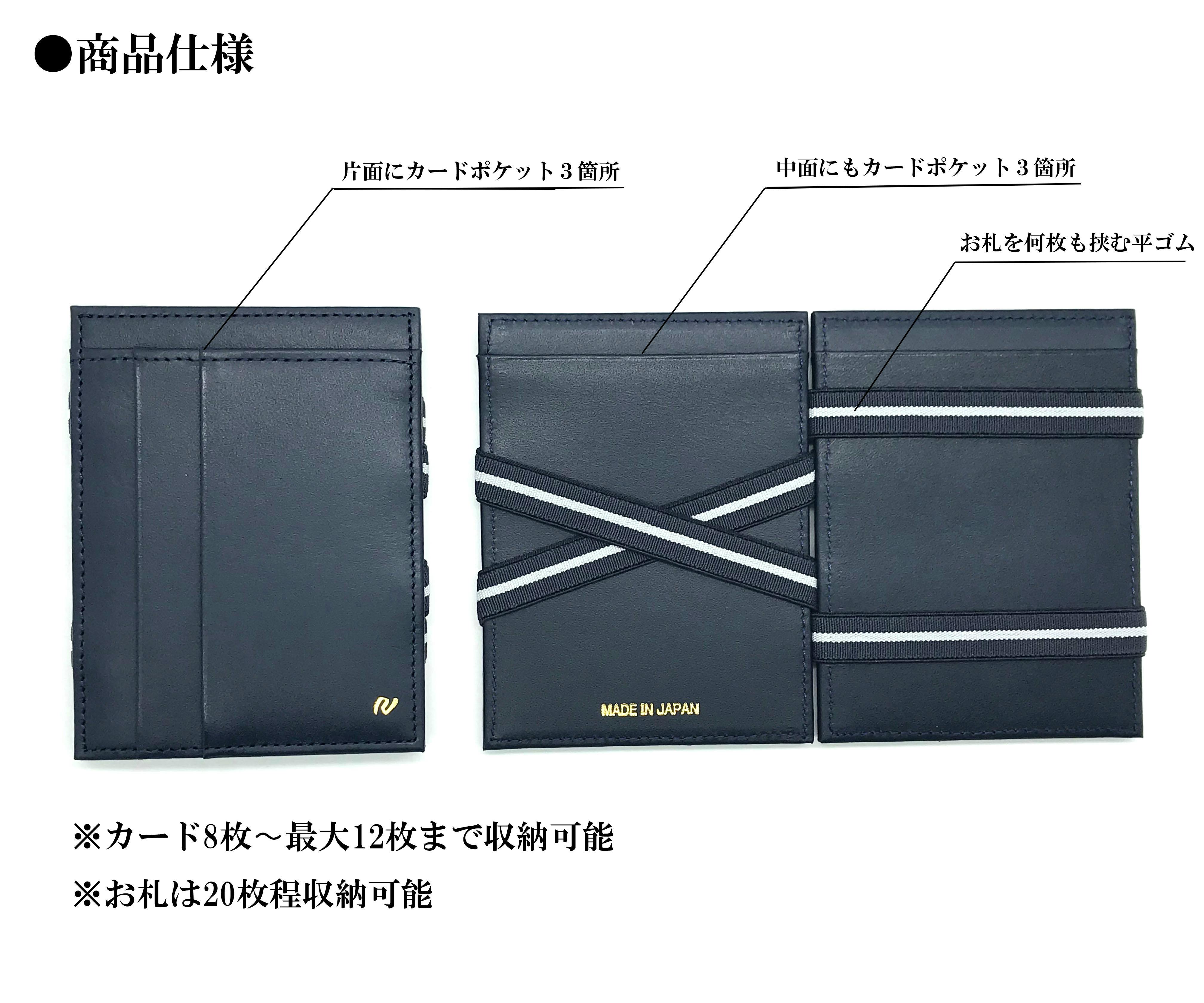 収納力:カード8枚〜最大12枚 お札20枚程度