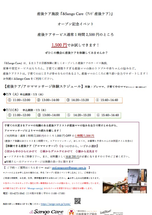 2019/06/25 13:50<&Sango Care Kyotoオープン記念イベント開催>7/9(火)と7/11(木)に通常1時間2,500円のところ1,500円にて産後ケアを体験できます!!静かで風通しの良い施設で、産院で多くの産後ママを癒してきたアロマの知識のある産後ケアリストに日頃の悩みを聞いてもらいながら癒してもらいましょう♬詳細は画像を見ていただくか、協会電話:03-6272-3542もしくはメール:and.sangocare@sango-care.jpまでお問合せください。※電話でのお問合せは、平日の月曜~金曜の11時~17時(土日祝祭日は除く)でお願い致します。 もっと見るキックオフミーティング