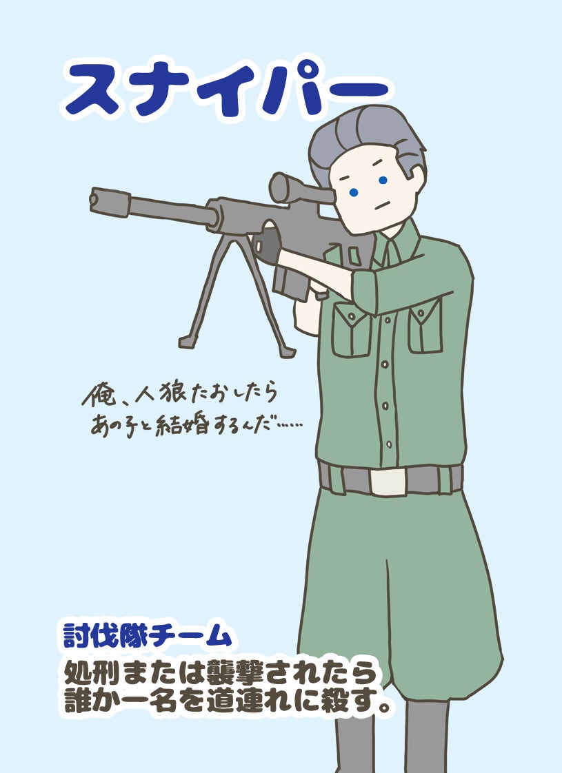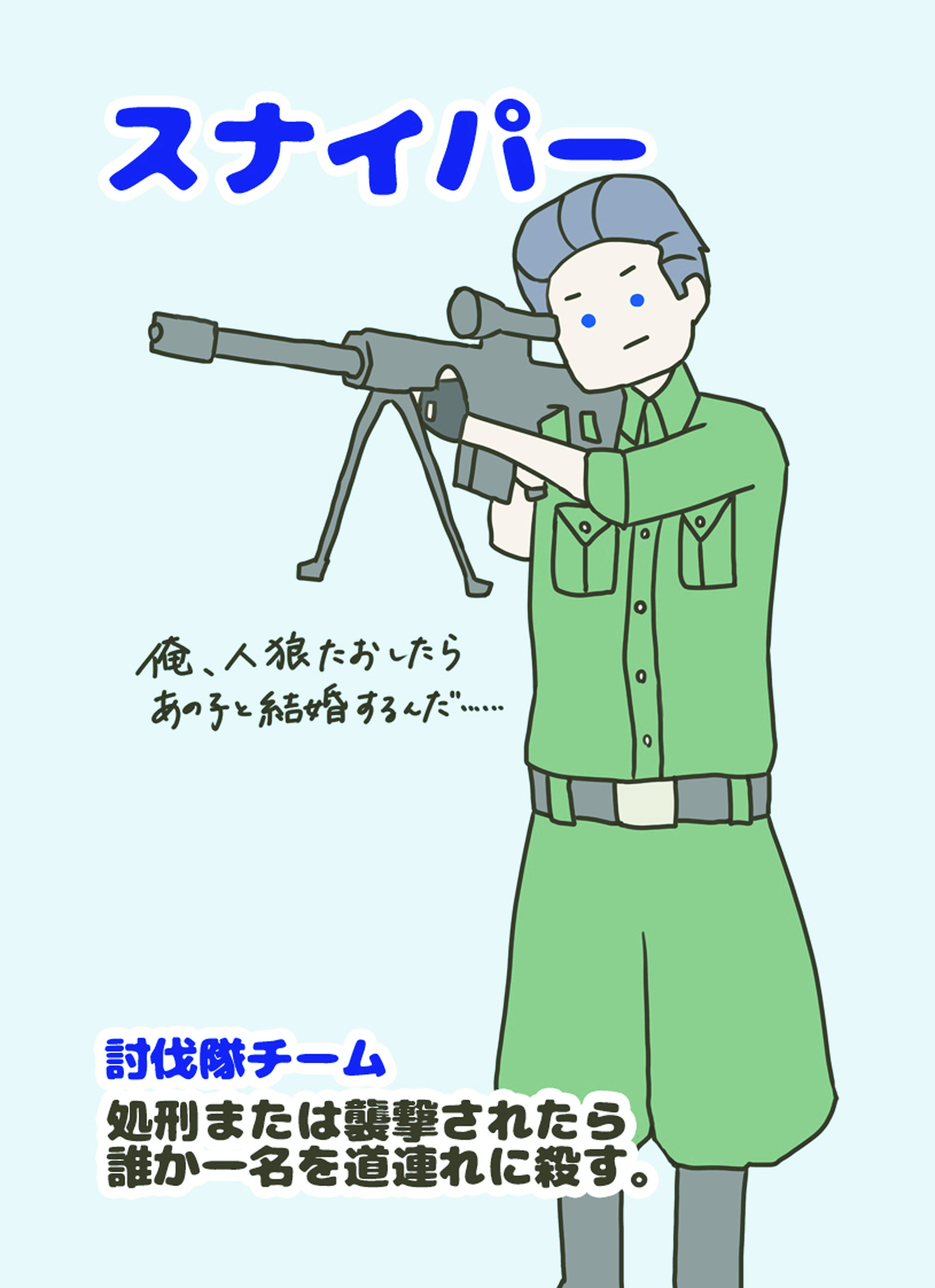 スナイパー:処刑または襲撃されたら誰か一名を道連れに殺す。