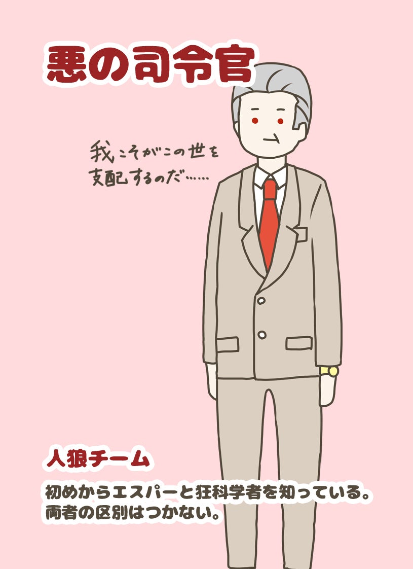 狂科学者:初めから人狼を知っている。司令官にエスパーと混同される。