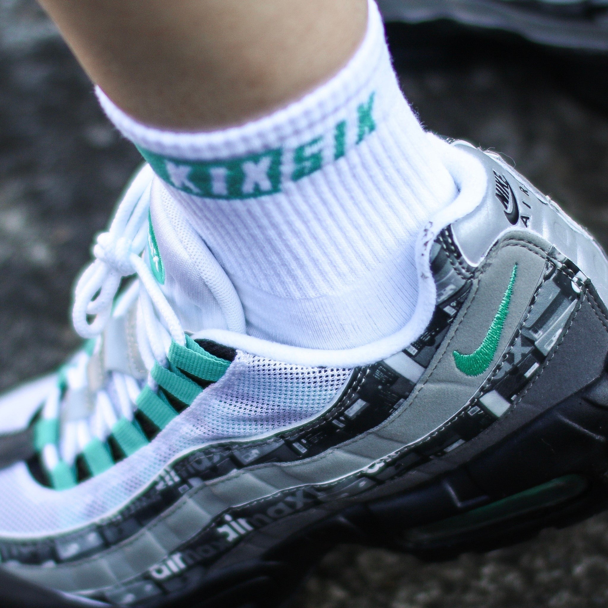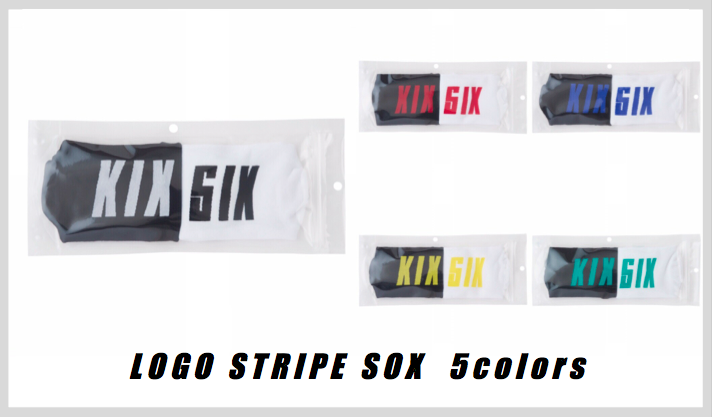デザインは、両足ともに外側にKIXSIXのロゴと足首を囲う1本のストライプ柄が、配色で編み込まれています。この柄部分の配色がコーディネイトのポイントとなり、アクセントにもなります。