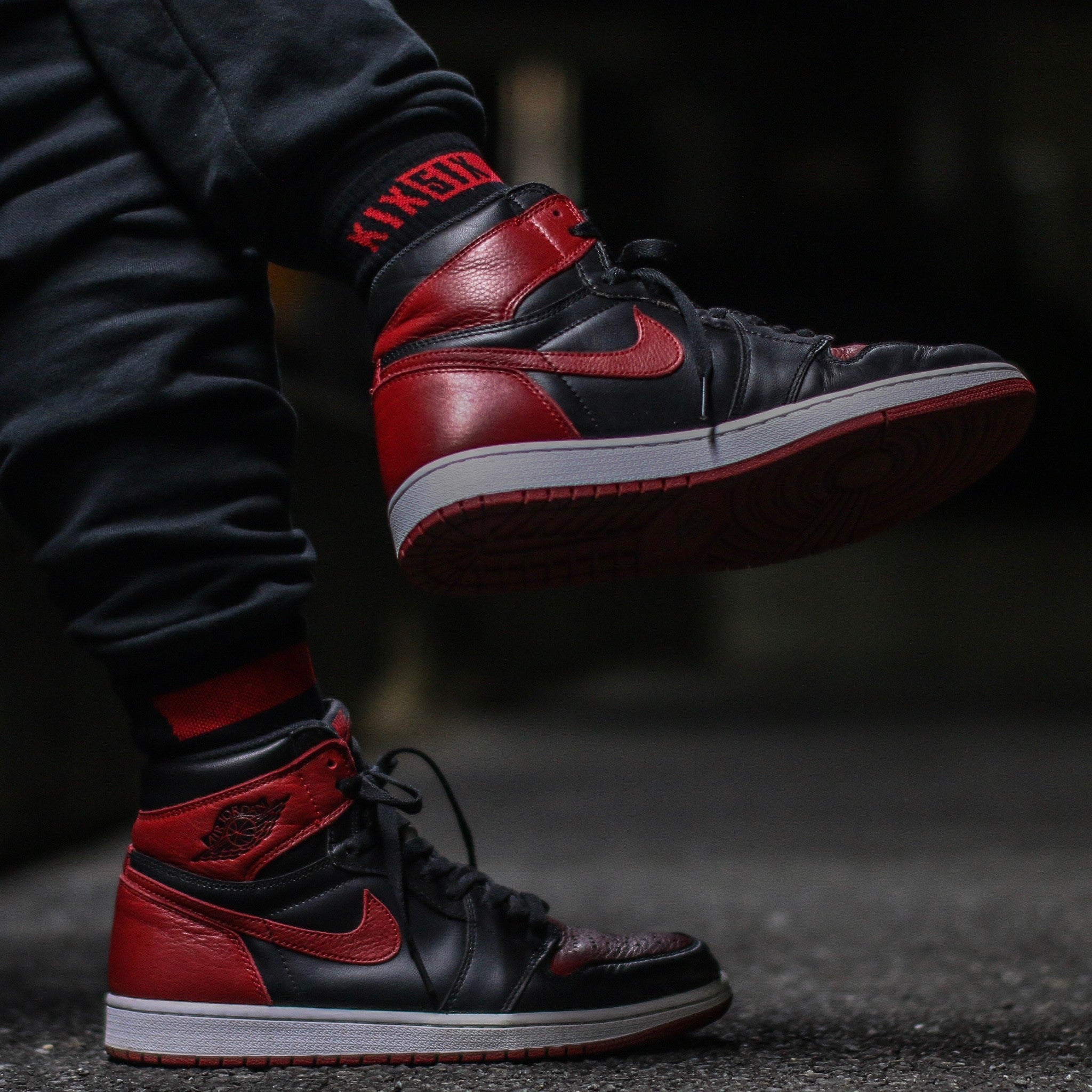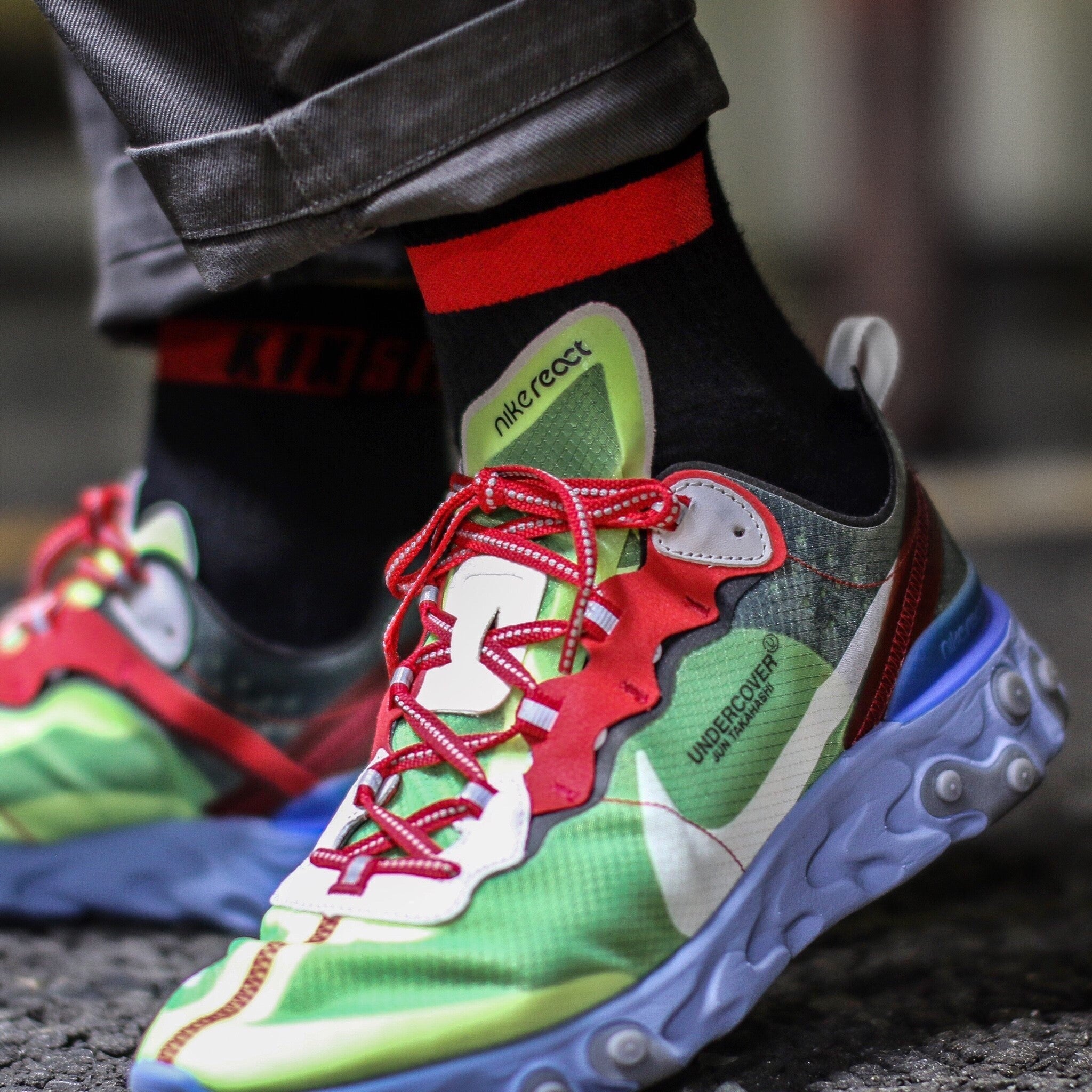 例えば、下の写真のように、赤いスニーカーを履く時は「差し色で赤が入ったソックスを履いてコーディネイトしたい」と思っても、お店にその様な商品はありません。