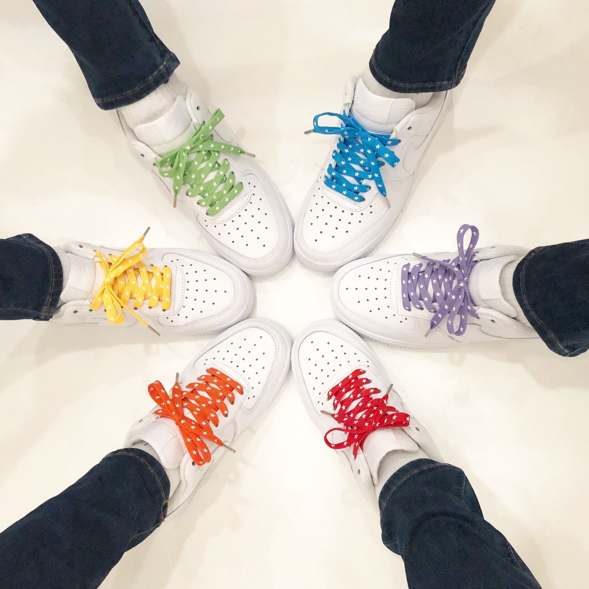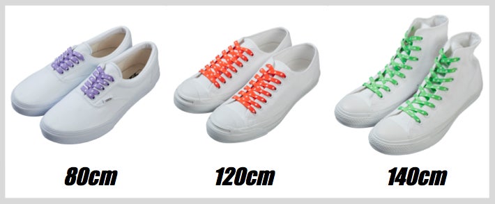 スニーカーはデザインによって紐の長さが違います。KIXSIXでは、長さの異なる4サイズ(80cm、120cm、140cm、160cm)を展開しておりますので、「NIKEのAIR FORCE 1には140cm」「adidasのSTAN SMITHには120cm」などと、お客様それそれが、お気に入りのスニーカーにピッタリの長さや色の商品を選ぶ事ができます。
