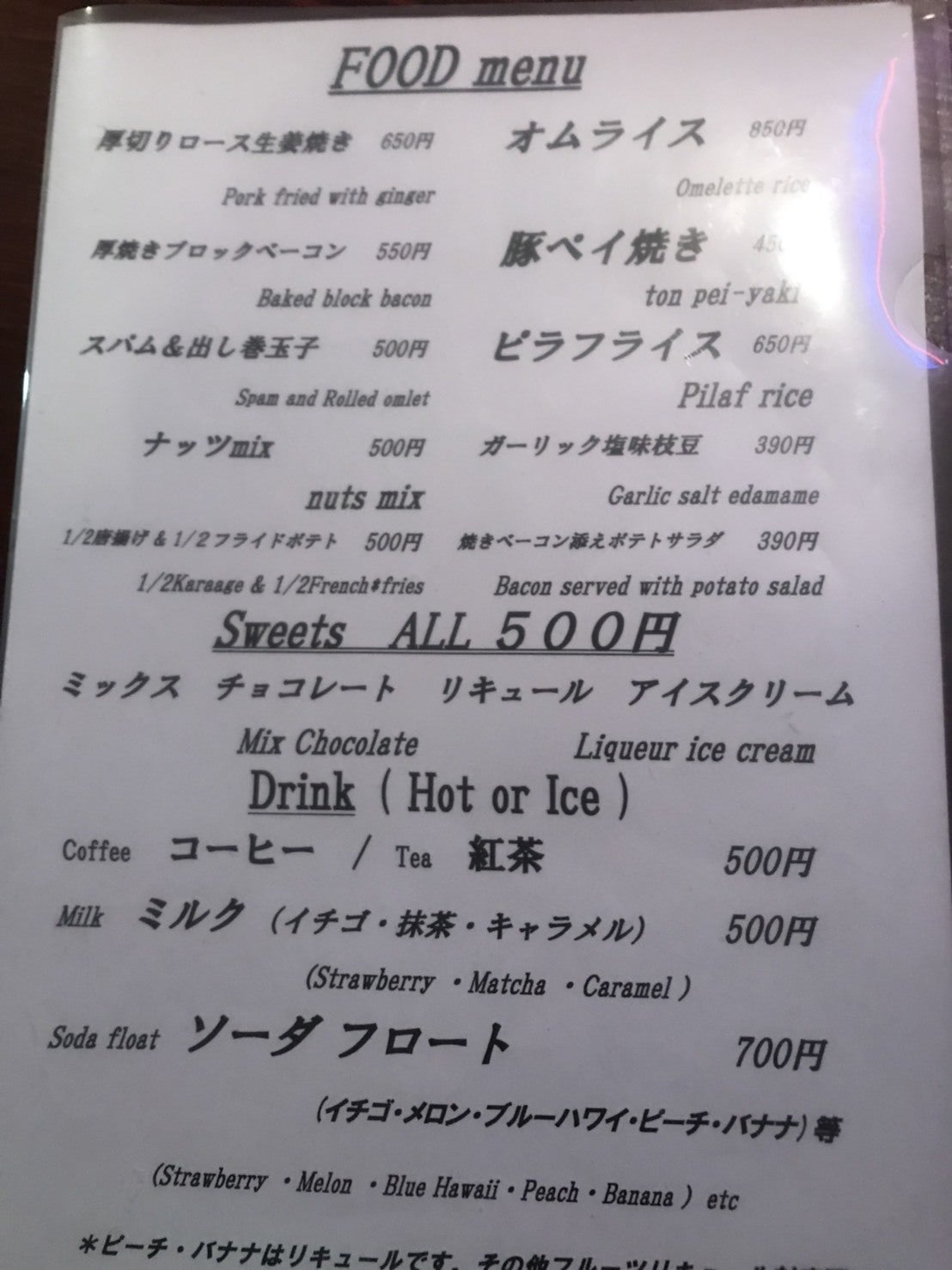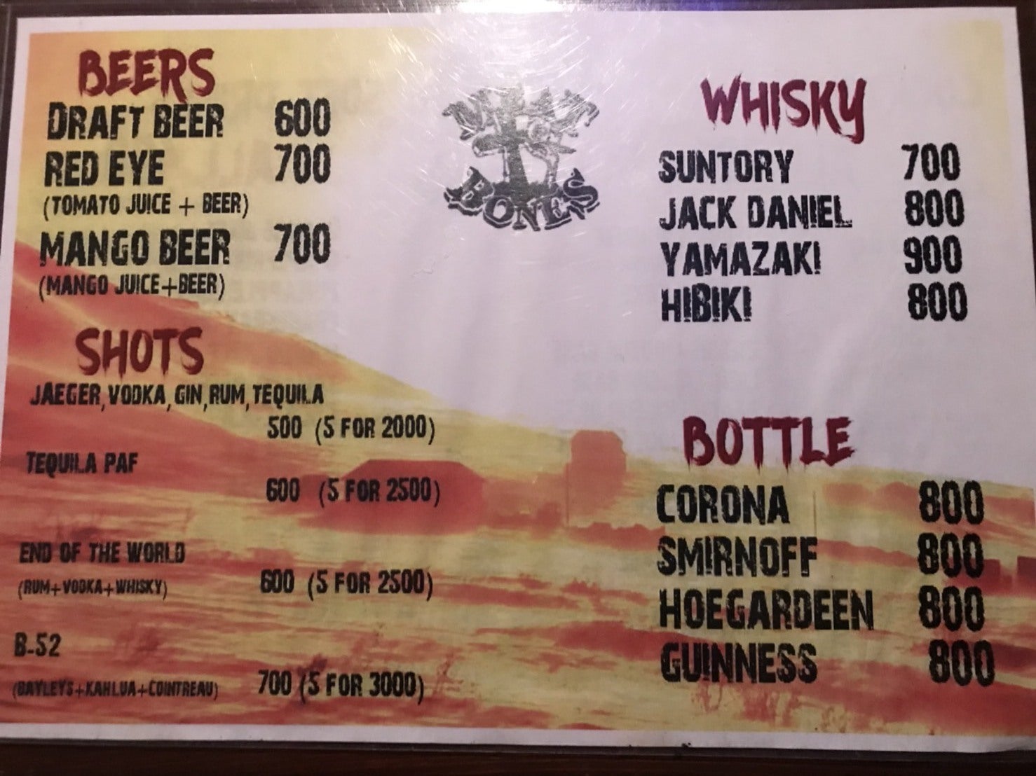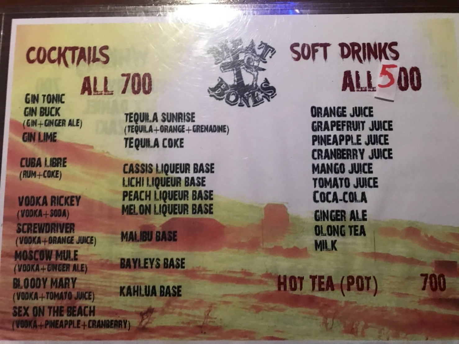 Soft drinks are 500 yen, beer is 600 and most of the cocktails are 700 yen.