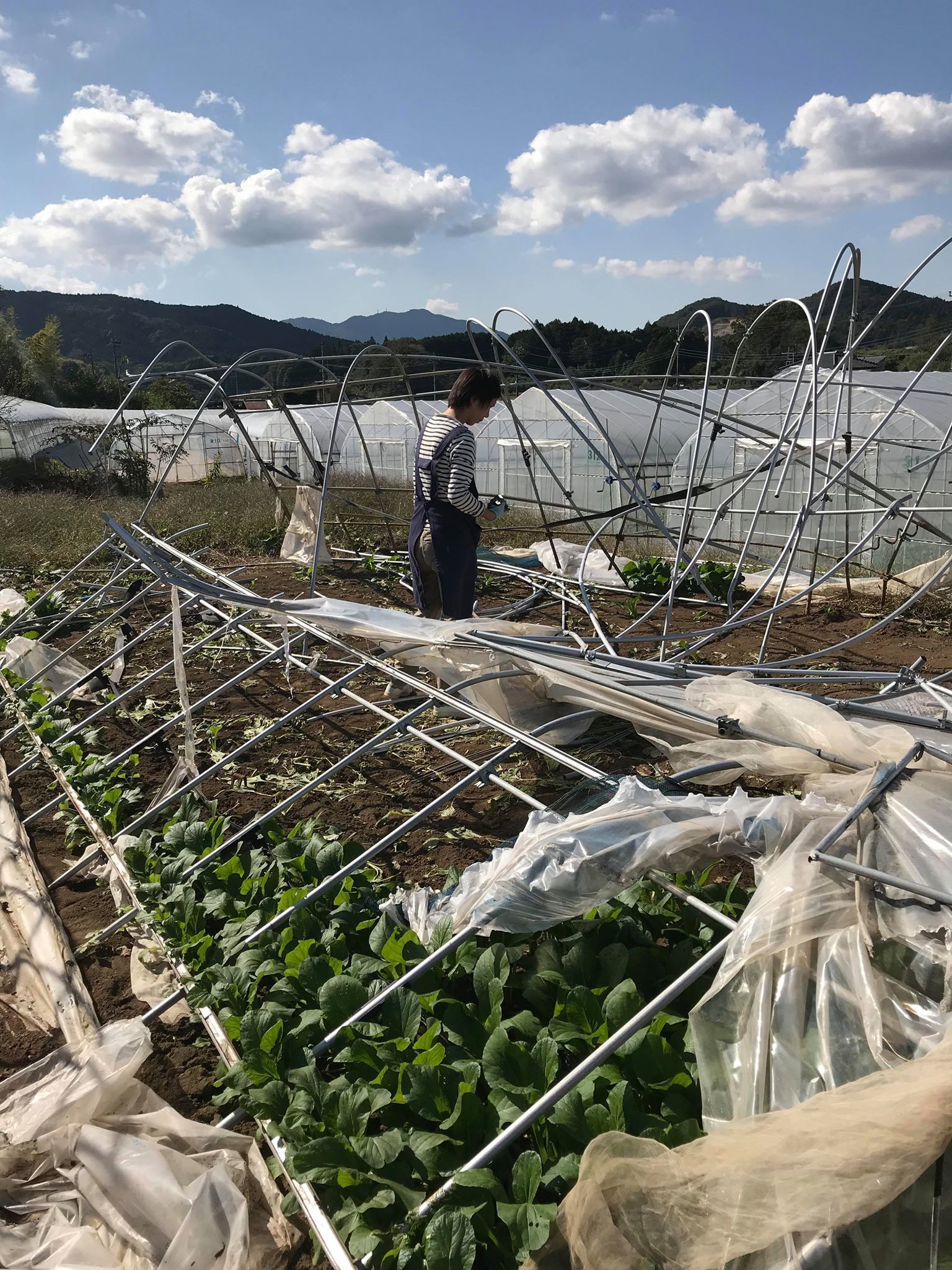 わたしたちは、茨城県笠間市で葉物野菜小松菜や、ほうれん草を生産するオーガニックファームで、夏はトマト、冬はイチゴを無農薬で生産しております。 平成30年10月1日の台風24号により、農業生産法人(株)カモスフィールドの農業用ハウス130a中、90aが被害にあいました。