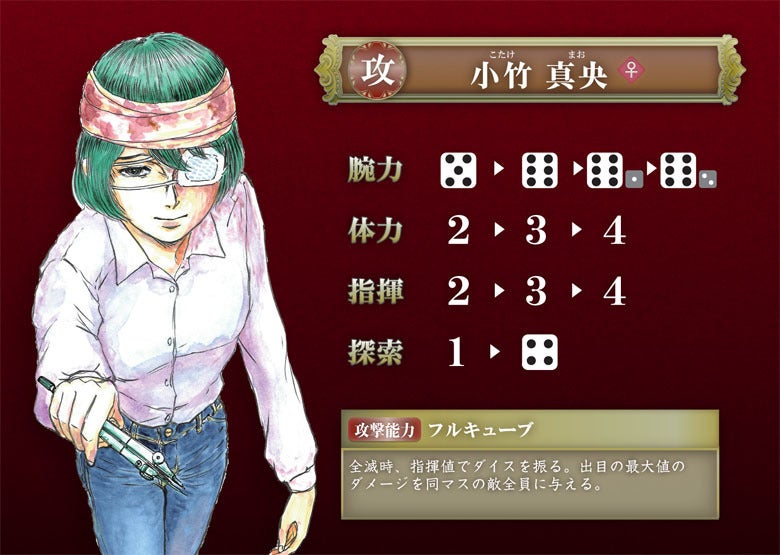 小竹真央(イラスト:武富健治)。『ダンゲロス1969』のヒロイン。モンスターへの直接攻撃が得意な「攻撃タイプ」で、高火力の固定ダメージを与えることができるダメージディーラー。ダメージが高い数値で安定するため作戦が立てやすい。全滅時に敵モンスターを道連れにする自爆能力を持ち、いざとなれば単騎特攻も可能。