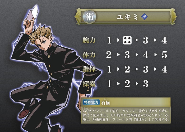 ユキミ(イラスト:横田卓馬)。『戦闘破壊学園ダンゲロス』『ダンゲロス1969』に登場。遠距離攻撃の得意な「術士タイプ」。初期ステータスは全体的に低めだが、自パーティーの魔人の効果範囲を拡張する能力『有無』が強力で、手札が増えれば増えるほど応用力と対応力が強化される。「術士タイプ」だが、育て方によっては直接攻撃や宝箱解錠も可能になる。