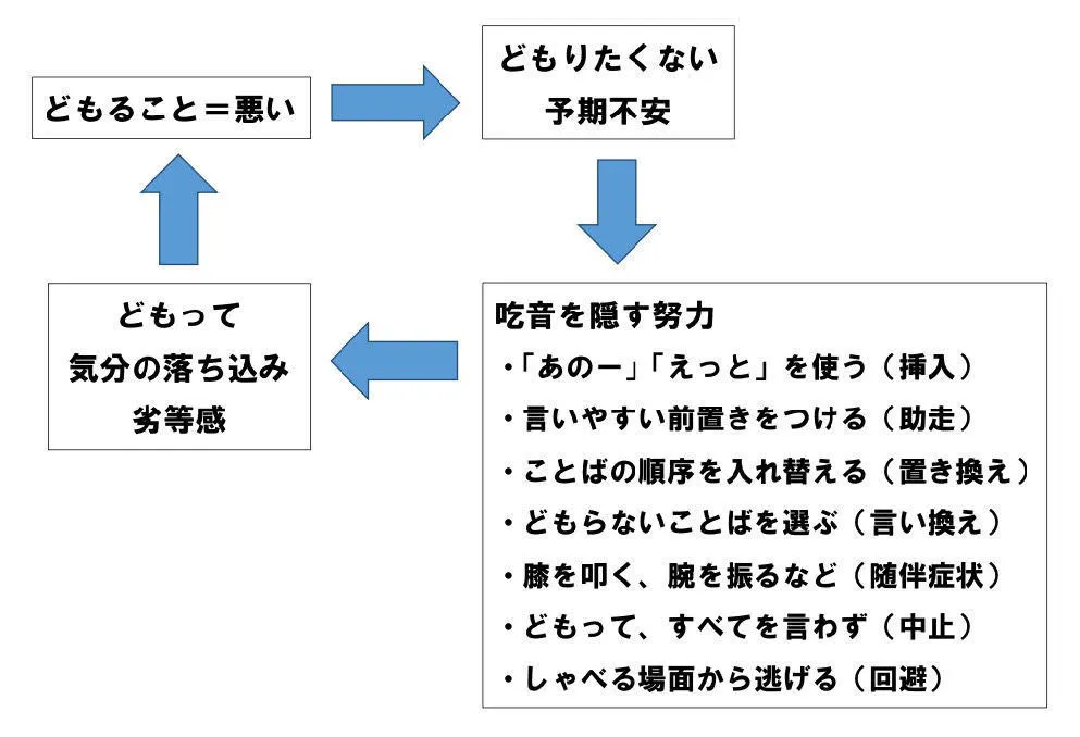 吃音のある人にとって辛いのは、話す前の予期不安とどもった(失敗した)後の落ち込みです。下図は「どもること=悪い」が引き起こす悪循環の図です。