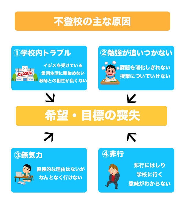 そこで当会では、『希望・目標』を不登校の生徒に持たせることが、根本的な不登校問題の解決に繋がると考えています。