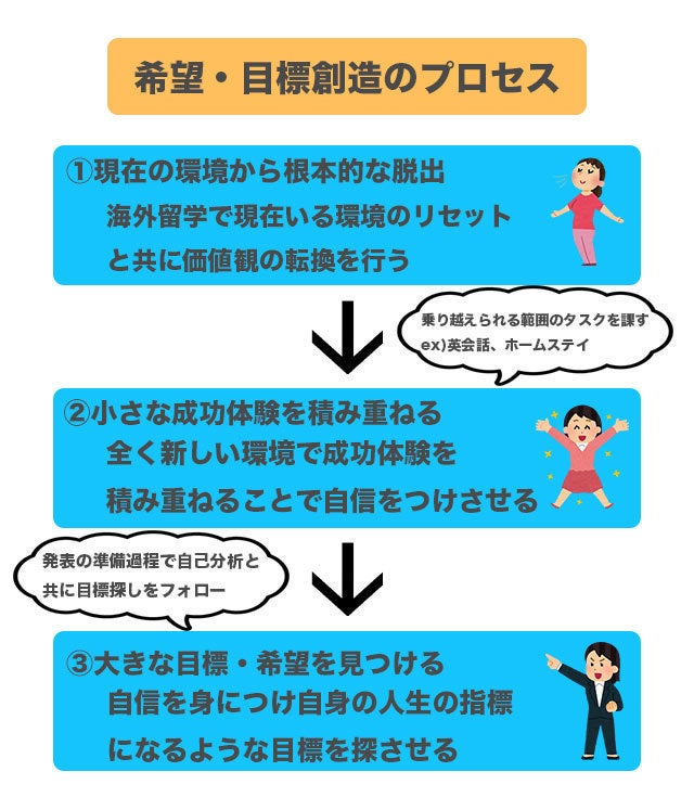 が可能となり上記のフローチャートに沿ったプロセスを通して『目標・希望』を身に付けることで不登校の子ども達に人間として成長してもらうのが当プロジェクトの目標となります。