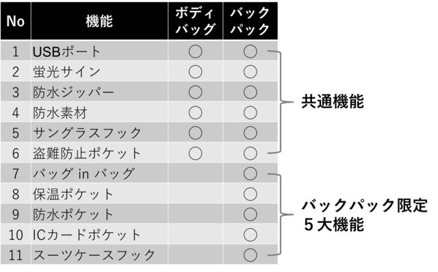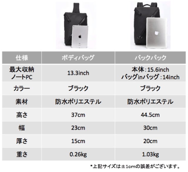 ※ボディバッグは弊社OEM製品、バックパックはTUGUAN社製品です。