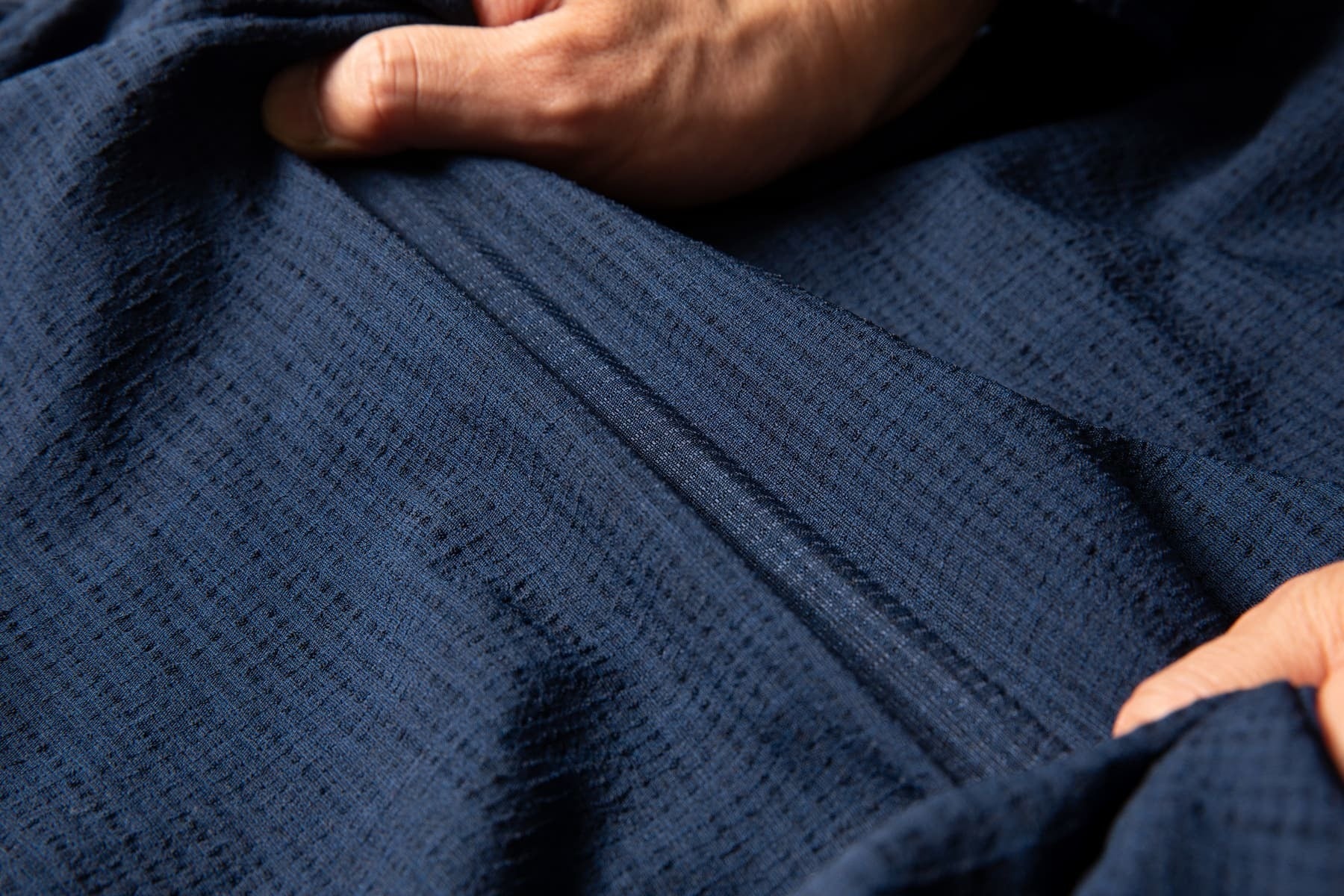 これらの作り方をもとにポリエステルの特性を最大限に活用し、「麻のようなカラっとした触感」で「ストレッチ性」があって「通気性の良い」素材を作ることができました。