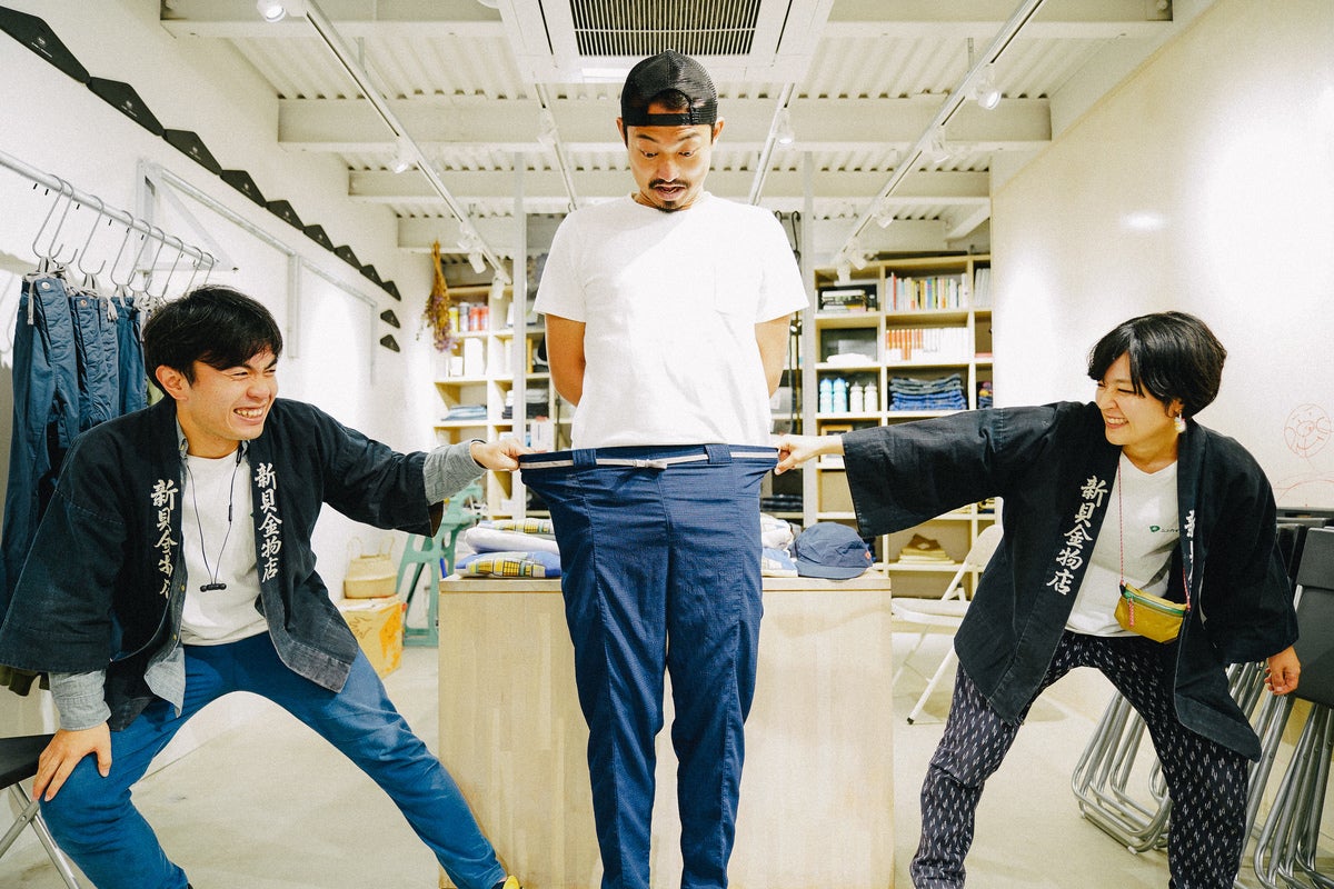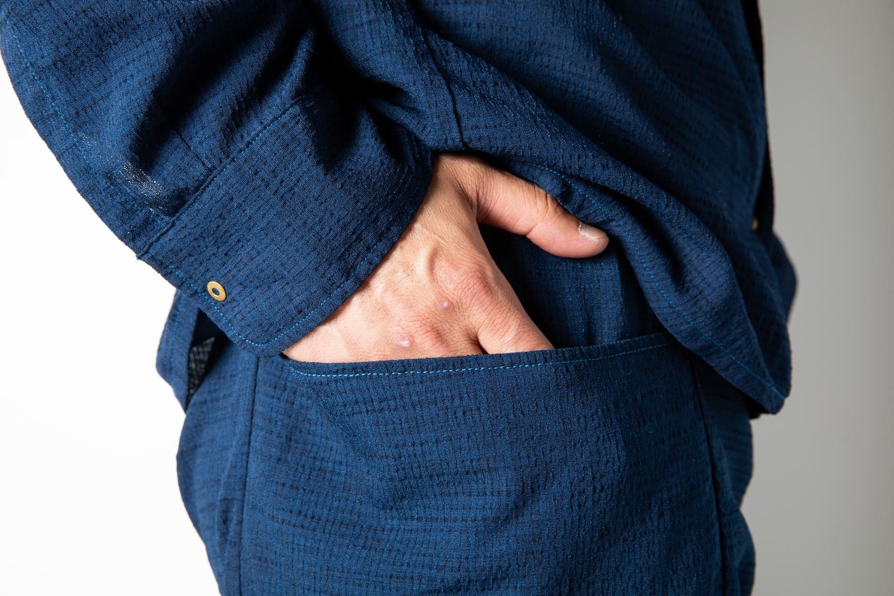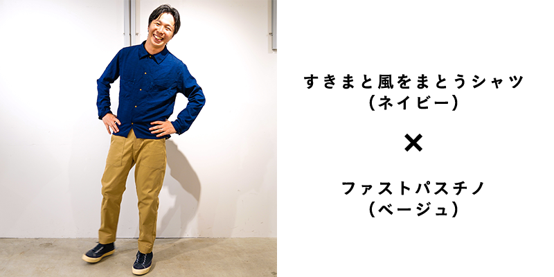 今回、新たに「麻のようなカラっとした触感」で「ストレッチ性」があって「通気性の良い」素材を開発し、その素材を使った、シャツとパンツを作りました。