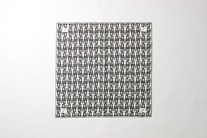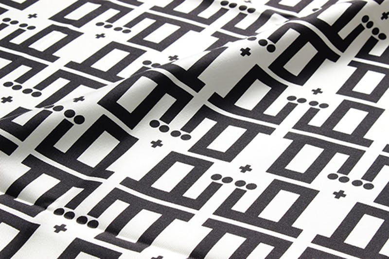 アイコンを幾何学的なグラフィックにした総柄です。柄は手で一枚一枚染めていく手捺染(てなっせん)という手法で仕上げてもらいました!ぱきっとした発色はそうした技術の表れでもあります。使う色の数だけ版を作り一色ずつ染めていくのでボヤけない仕上がりなんです。