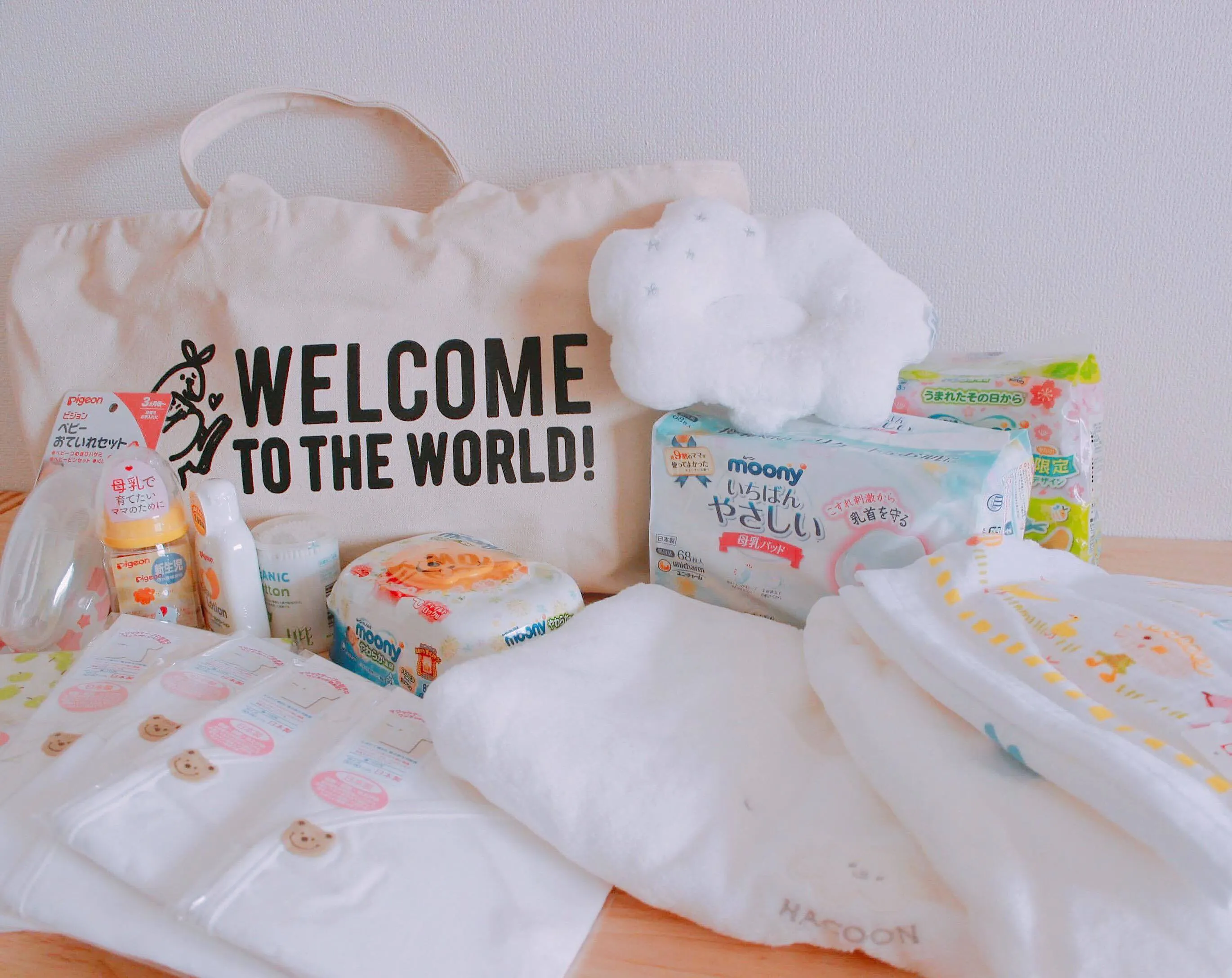 短肌着・長肌着・コンビ肌着・ツーウェイオール・おくるみ、ブランケット、紙おむつ、おしりふき、授乳クッション、哺乳瓶、哺乳瓶洗浄グッズ、粉ミルク、母乳パッド、ベビーバス、ベビーソープ、ガーゼ大、ガーゼ小、沐浴剤、ベビー綿棒、爪切り、アルコール消毒、清浄綿、ベビーローション、体温計、鼻吸い器、スタイ、靴下、ミトン、帽子、など