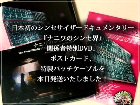 2014/10/29 22:09皆さん、今晩は。 『ナニワのシンセ界』監督の大須賀です。 大変お待たせしましたが、 ついにこの日がやってきました。 このプロジェクトの一番の目玉リターンでもあります、 『ナニワのシンセ界』DVDを4000円以上の支援者の皆さん全員に、 本日発送させていただきました! 4000円以上の支援者の方にはポストカード、 10000円以上の支援者の方にはポストカードと特製パッチケーブルを同封してあります。 お手元に届きましたら、ご確認ください。 今回のDVDは一般発売にはない特典映像も追加されていますので、 到着しましたら、皆さんのご自宅で、是非じっくりとご覧頂ければと思います。 では、お手元に届きますまで、しばしお待ちください! ※一部地域、離島などにお住まいの方は到着までにお時間をいただく場合があります。 今後とも『ナニワのシンセ界』をどうぞ宜しくお願いいたします。 大須賀淳 もっと見る