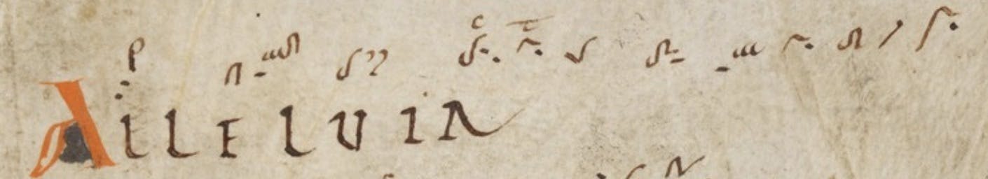 グレゴリオ聖歌は9世紀頃、保存・伝播のために歌い方が書き留められ始まりました。これは「古ネウマ」と呼ばれ、現代の楽譜・記譜法の祖先といえますが、この「古ネウマ」のあり方は現代の楽譜とはかなり様相の異なったものでした。