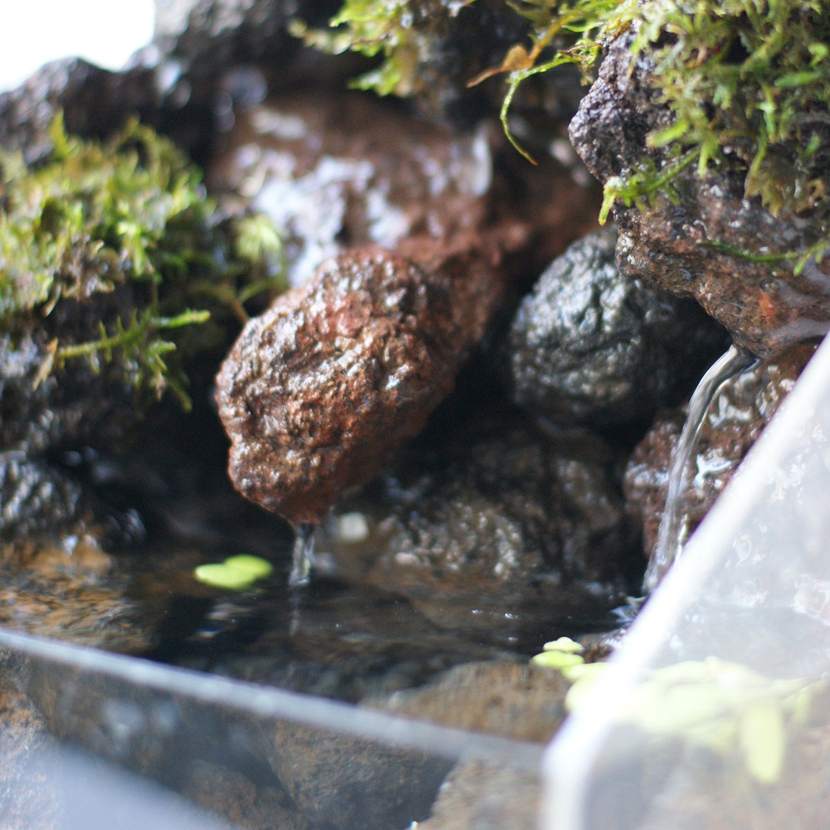 ポンプから流れ出た水は、岩を伝ってゆっくりと流れ落ちていきます。