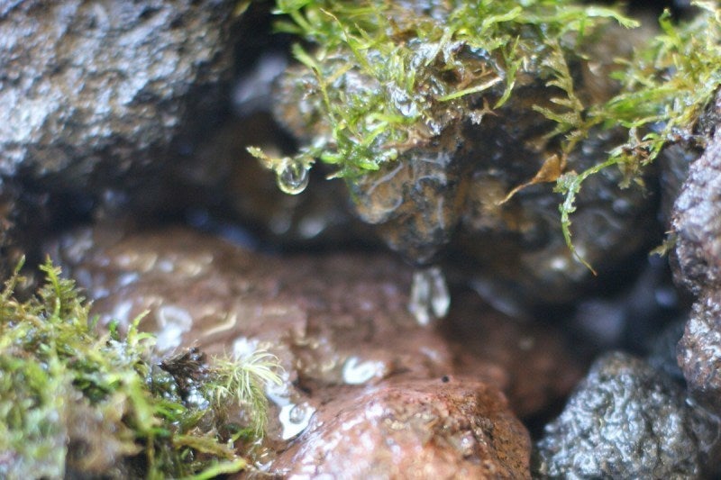 場所によっては苔にしみ込んだ水がじわりとしみ出し、やがて1つのしずくになり、ポトリと落ちます。