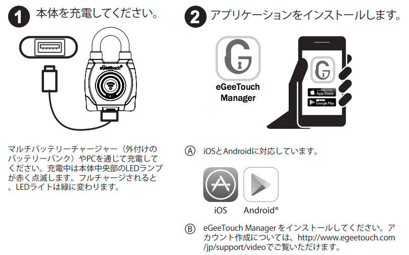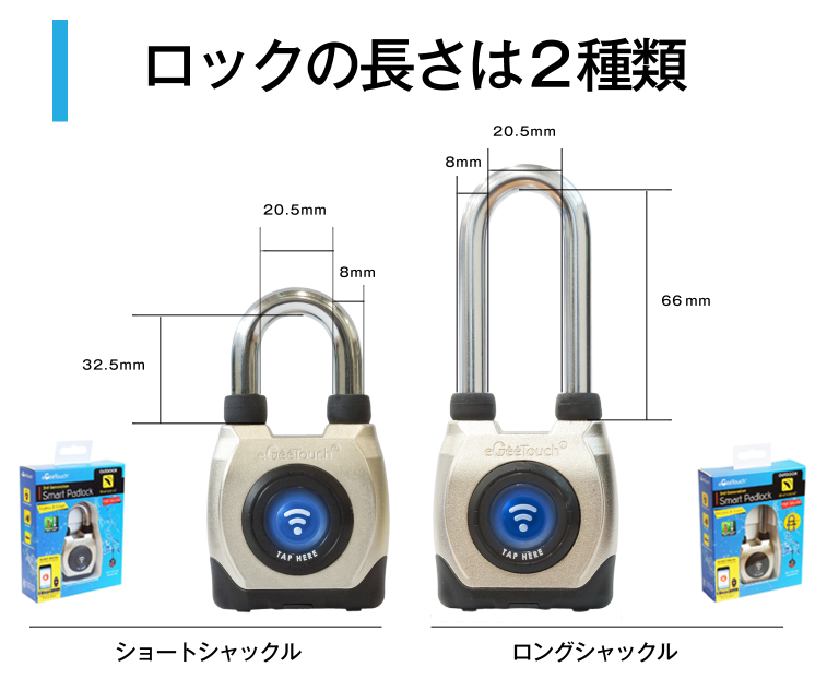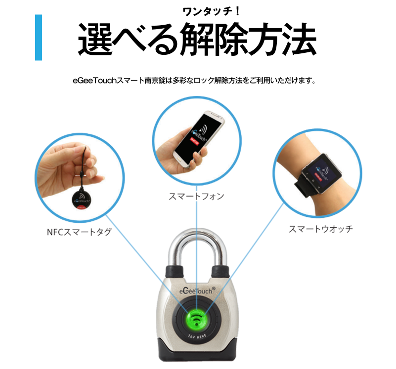このスマートパドロックは、スマートフォンでダウンロードするアプリケーション「eGeeTouch Manager」やNFCタグなどで簡単に施錠と解錠ができます。