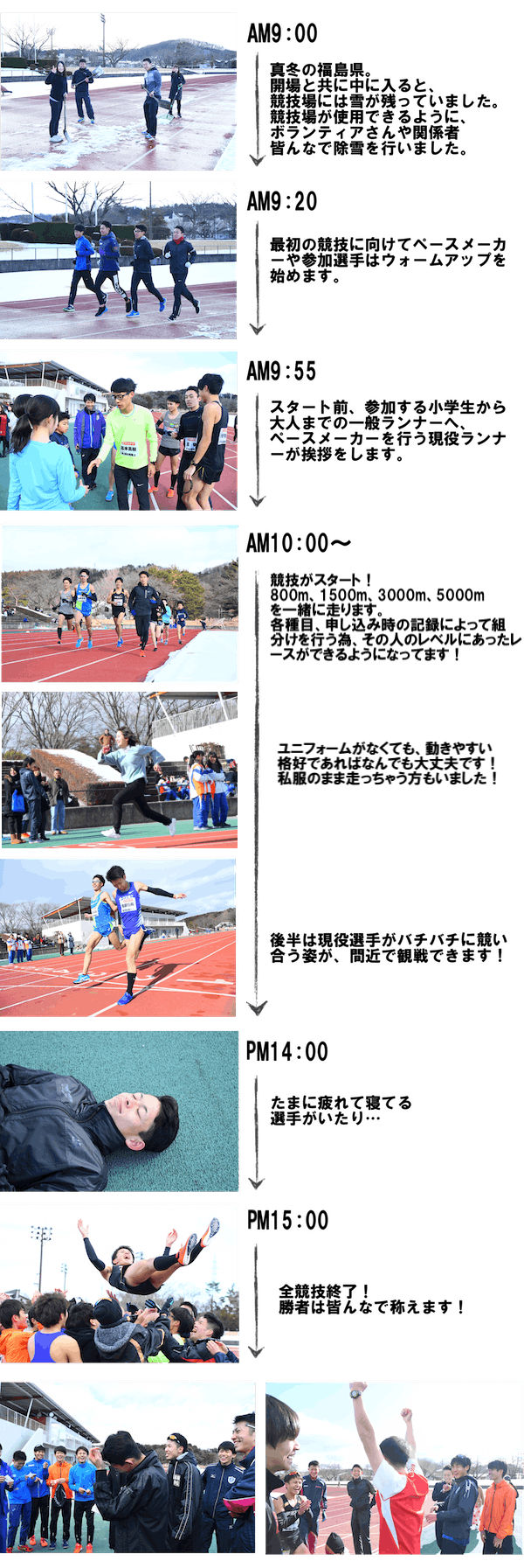 福島県出身のトップアスリートを中心としたランナーと、地域内外の様々なランナー(子どもから高齢者まで)が一同に会して行うトラックイベントです。福島にランニング文化を根付かせ、肥満度が高い福島県民の健康に寄与すると共に、トップアスリートと県民が交流する事で走る楽しさを広げていきたいと考えてます!