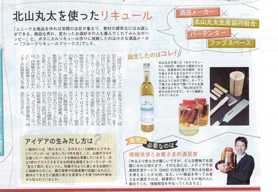 木のリキュールはそれ単体で面白い商品です。うちとしてはそれで十分ですが、材料を提供いただいた恩返しもかねてマスコミの注目を集めるべく、雑誌・新聞などに働きかけています(上記記事もその一環です)。