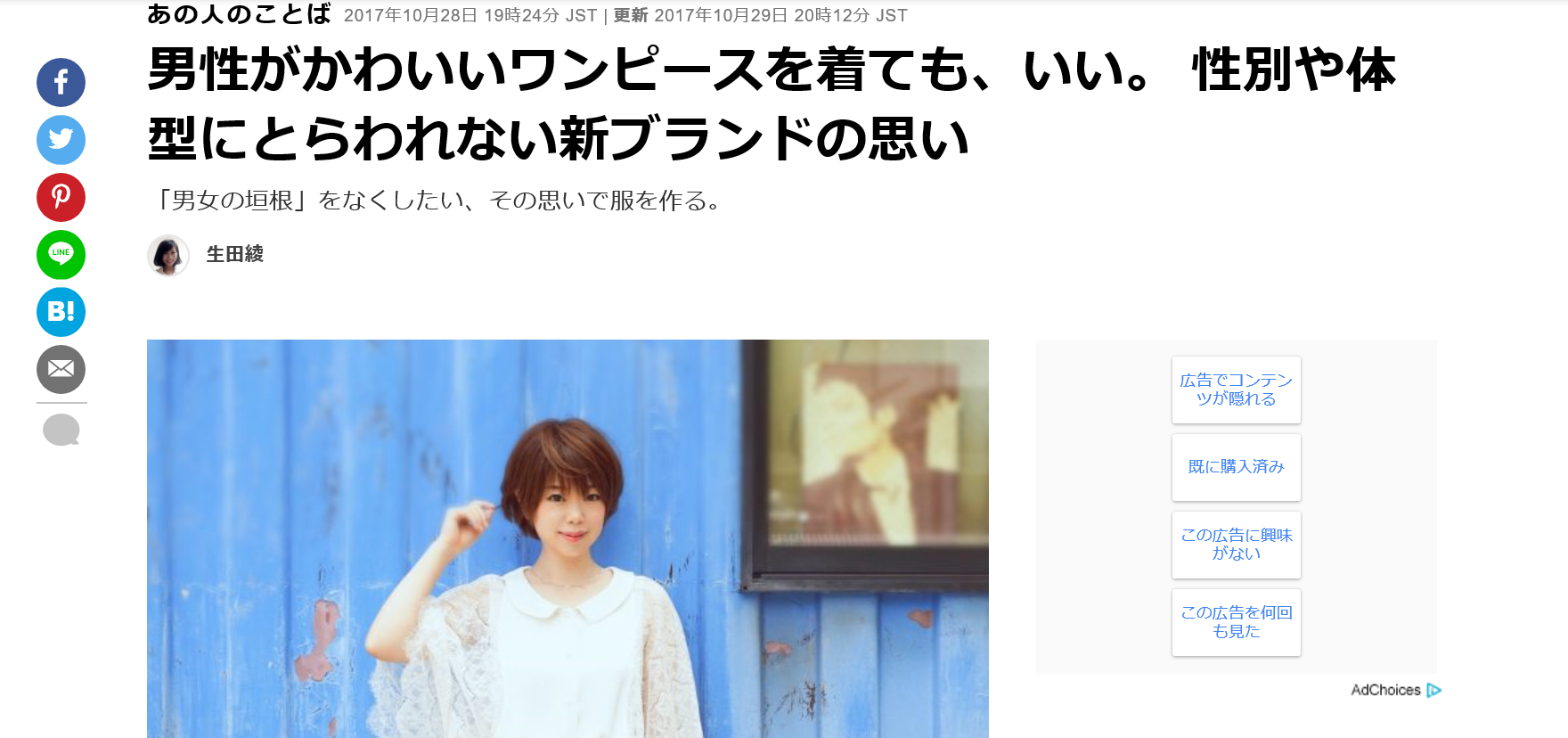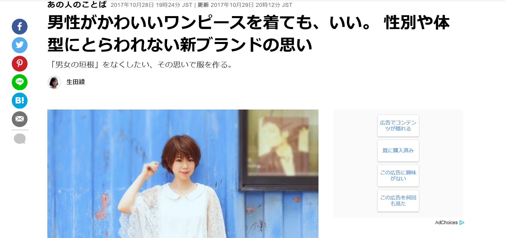 ・2017年10月28日 ハフィントンポスト 男性がかわいいワンピースを着ても、いい。 性別や体型にとらわれない新ブランドの思い 「男女の垣根」をなくしたい、その思いで服を作る。