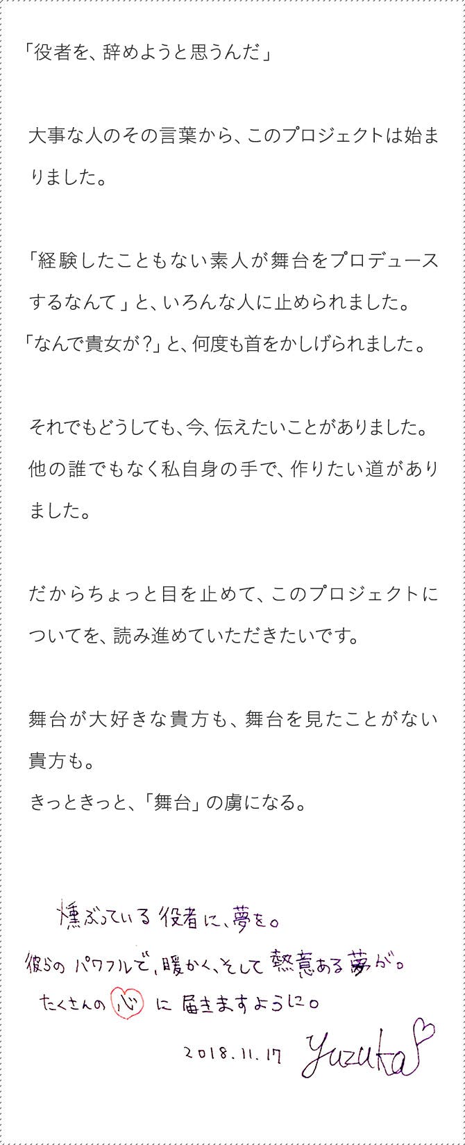 • 皆様のご支援のおかげで、クラファン開始4日目。100万円を達成しました。言葉が見つかりません。ただ、この100万円は「善意」が形になったものだと思っています。「夢」が、形になったものだと思っています。皆さまに最後のお願いです。400%達成まで、残りわずか。と同時に、クラファンの残り時間が、70分をきりました。もう、何も言いません。ただ、見に来てほしいです。何かにもめるたび、ぶつかるたび、諦めようとするたび。主演の堤下さんを含めた役者さんたちに、何度もかけられた言葉があります。「だけど作品は、めちゃくちゃ面白いんです」脚本、見ました。お芝居も、届きました。多分終わったあと、立って拍手がしたくなるくらい、めちゃくちゃ面白いものが仕上がっています。私はみなさんに、この作品を、どうしても見て欲しい。「演劇」はまだまだ課題があるけど、この舞台が終わったあとも、私はまだ、投げ出すつもりはありません。まずは、一歩。まずは皆さんに、「演劇」の良さを体感していただきたい。お願いします。劇場に、来てください。残り70分、悩んでいる誰かの心に、この言葉が届きますように。yuzuka大好きで尊敬するデザイナー、井上祐一さんと、コピーライター、長谷川哲士さんが手がけてくださったチラシ。たくさんの人の思いが、この舞台には詰まっています。yuzuka もっと見る