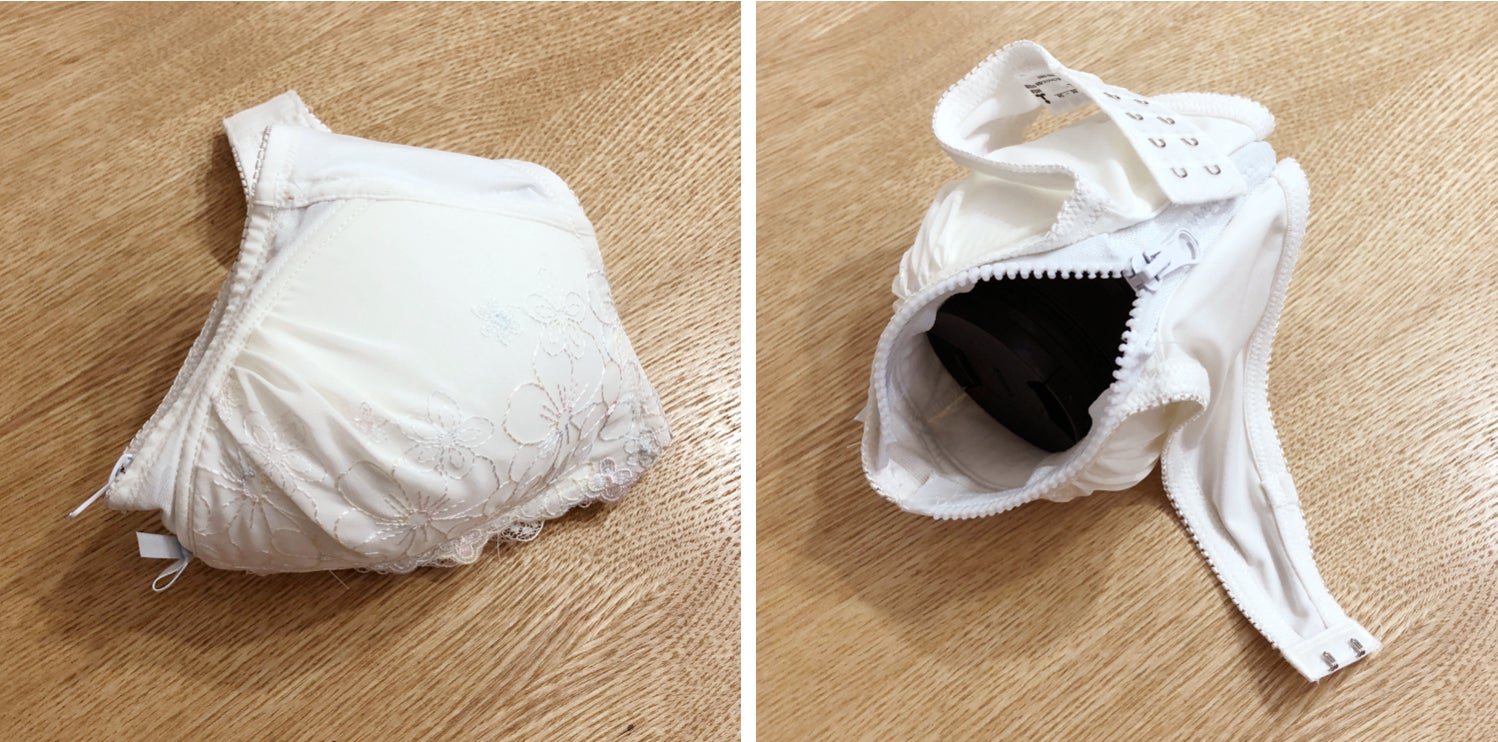 実際に下着として使用するものとほぼ同様のブラジャーをベースに、ファスナーを取り付けて閉じられるようにすることで、ファッションアイテムとして持ち歩くことのできるポーチを実現しました。