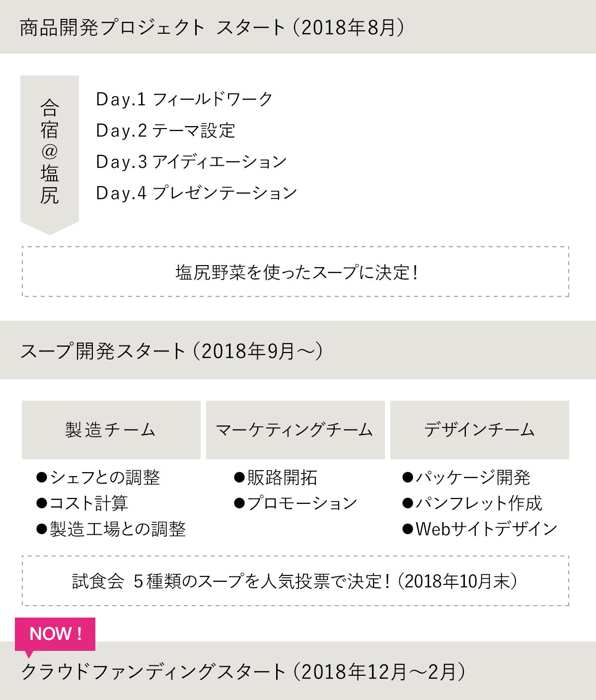 8月の合宿から始まり、スープの開発が始まってからは製造チーム・デザインチーム・マーケティングチームに分かれて活動し、週1日の全体ミーティングで情報共有をしながらプロダクトのブラッシュアップを図ってきました。