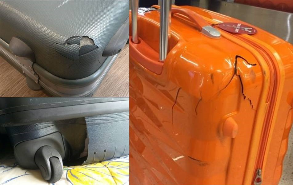 ABS系キャリーケース:空港手荷物運搬中、角の強い衝撃で破損された例