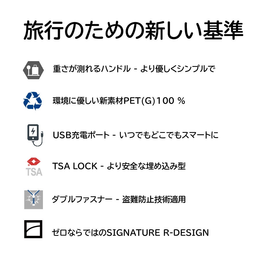 ZEROは既存のPETより弾性、強度、耐久性、耐熱性を全て強化すた新素材PET(G)を使いました。PET(G)は構造上、分子と分子との間の引力が強いため耐久性がより向上した素材です。そしてPETは、従来のキャリーケースに使われるABSやPCみたいに割れるように壊れる危険が少ないので安全に使っていただけます。