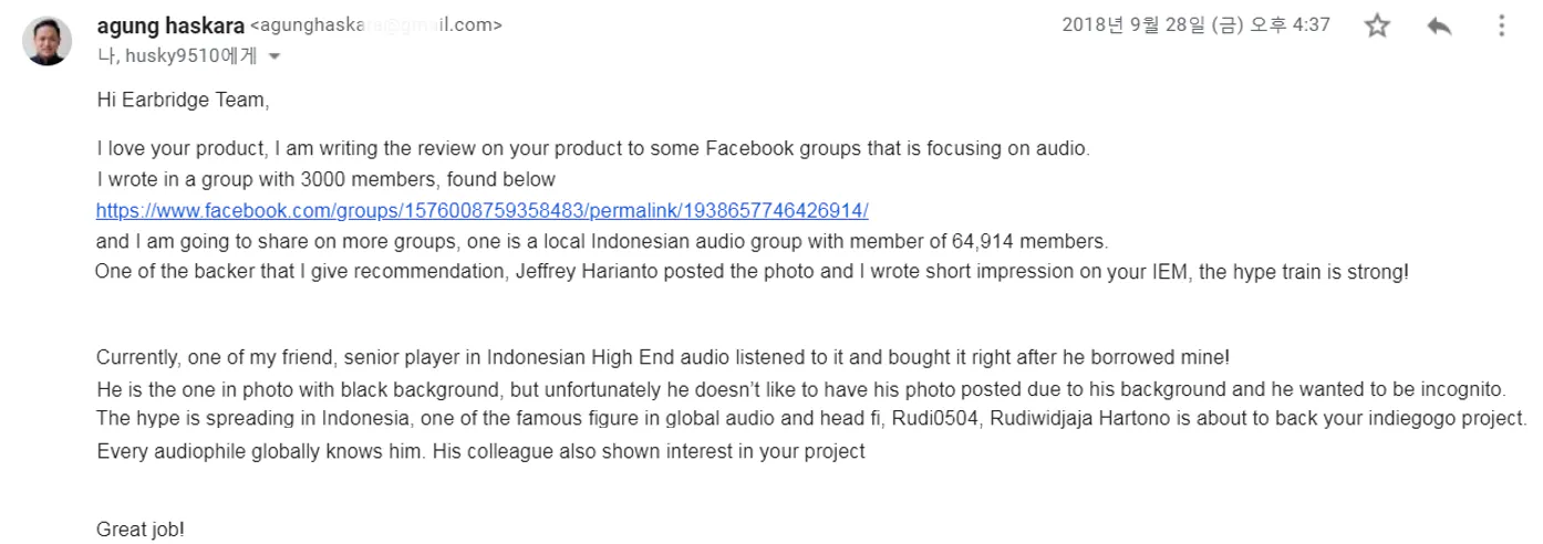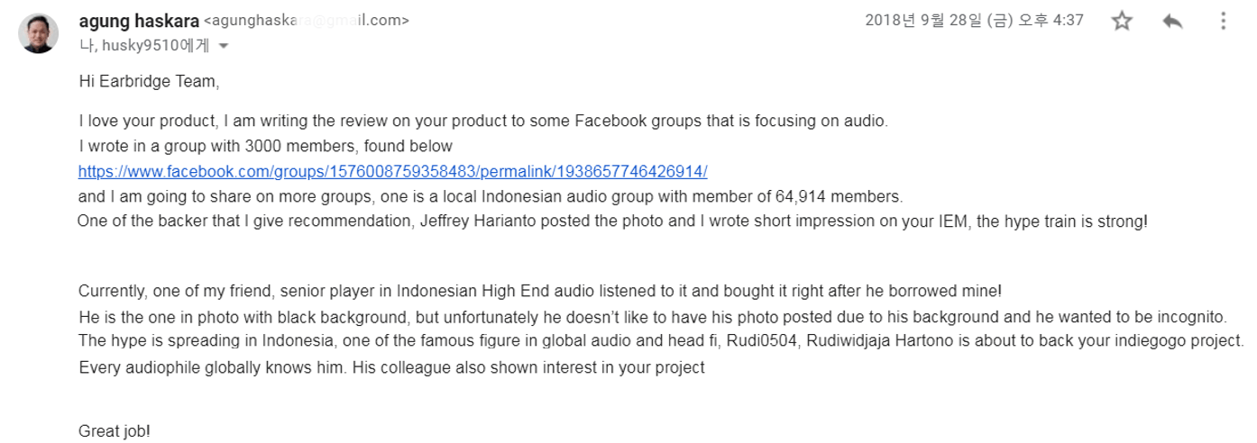 2019/12/10 14:50こんにちは。EARBRIDGEです。20番目の活動報告を開始します! 1回目、2019年12月10日、発送現況総勢136人発送完了:136人2回目、いよいよすべてのパトロン様にリターンが送信されました!HPSD E70を介してすべてのパトロン様に良い音と楽しさを与えることを願って。今後すべてのお問い合わせは、support@earbridge.netに連絡してください!A / S、製品のお問い合わせ、問題発生等の顧客のすべての疑問に最善を尽くして対応いたします。いつもEARBRIDGEは大きく開いています。フィードバックや問い合わせがございましたら、いつでもご連絡お願いいたします。現在、多くのパトロンに素晴らしいフィードバックを受けました。そして送ってくださったフィードバックを適用して、より良い製品を披露するために準備中です。多くの期待お願いします。今後、より楽しく、特別なプロジェクトを準備した後、皆さんに戻ってくることです。誰でも楽しく楽しむことができる最高のサウンドを披露するためにEARBRIDGEは走り続けていきます。みなさんぜひまた会いましょう!また会う日までのすべてのパトロン様の健康を願っています! もっと見る#UPDATE 11月29日#第十六番目の活動報告!発送状況伝達とイベントニュース