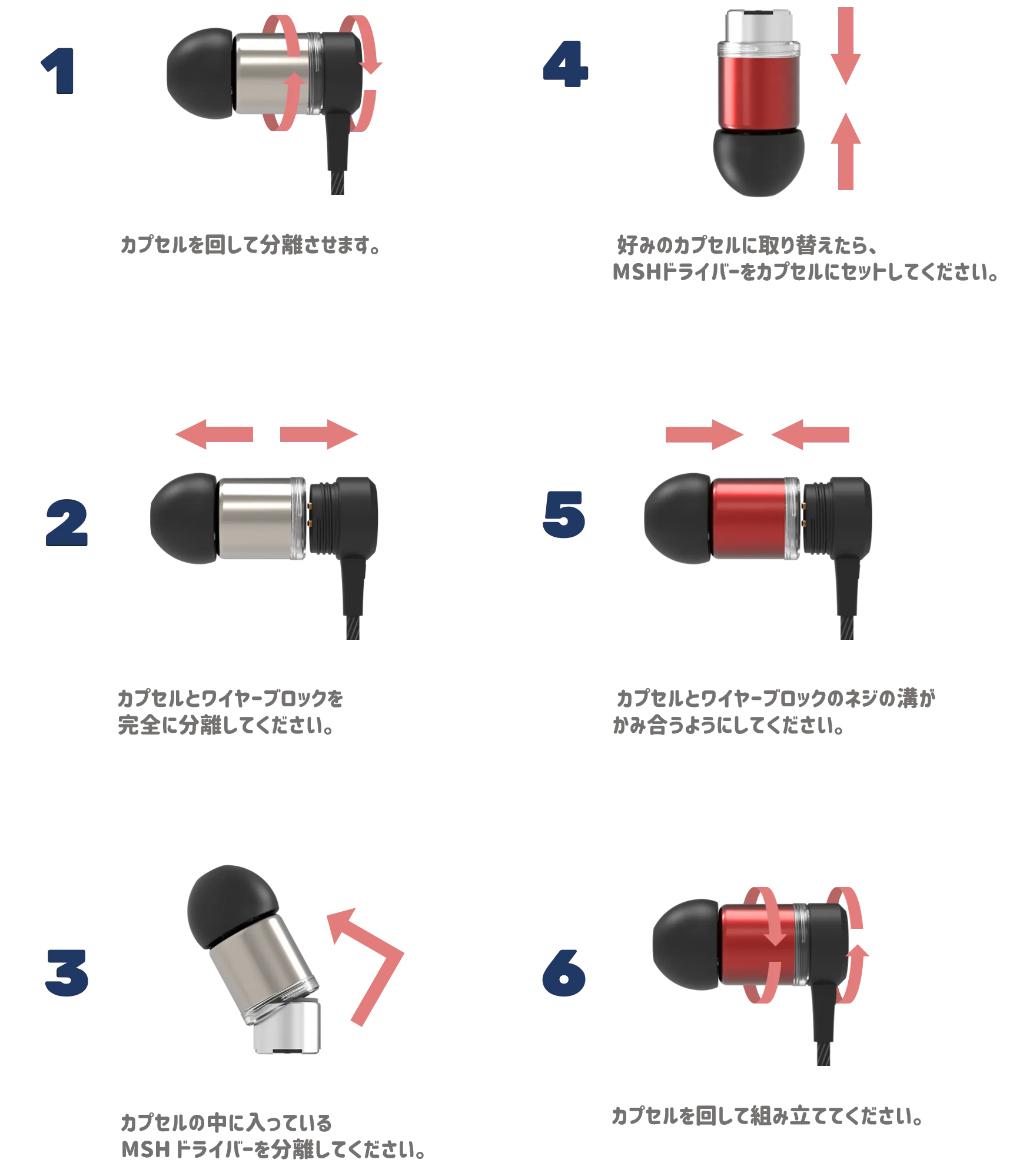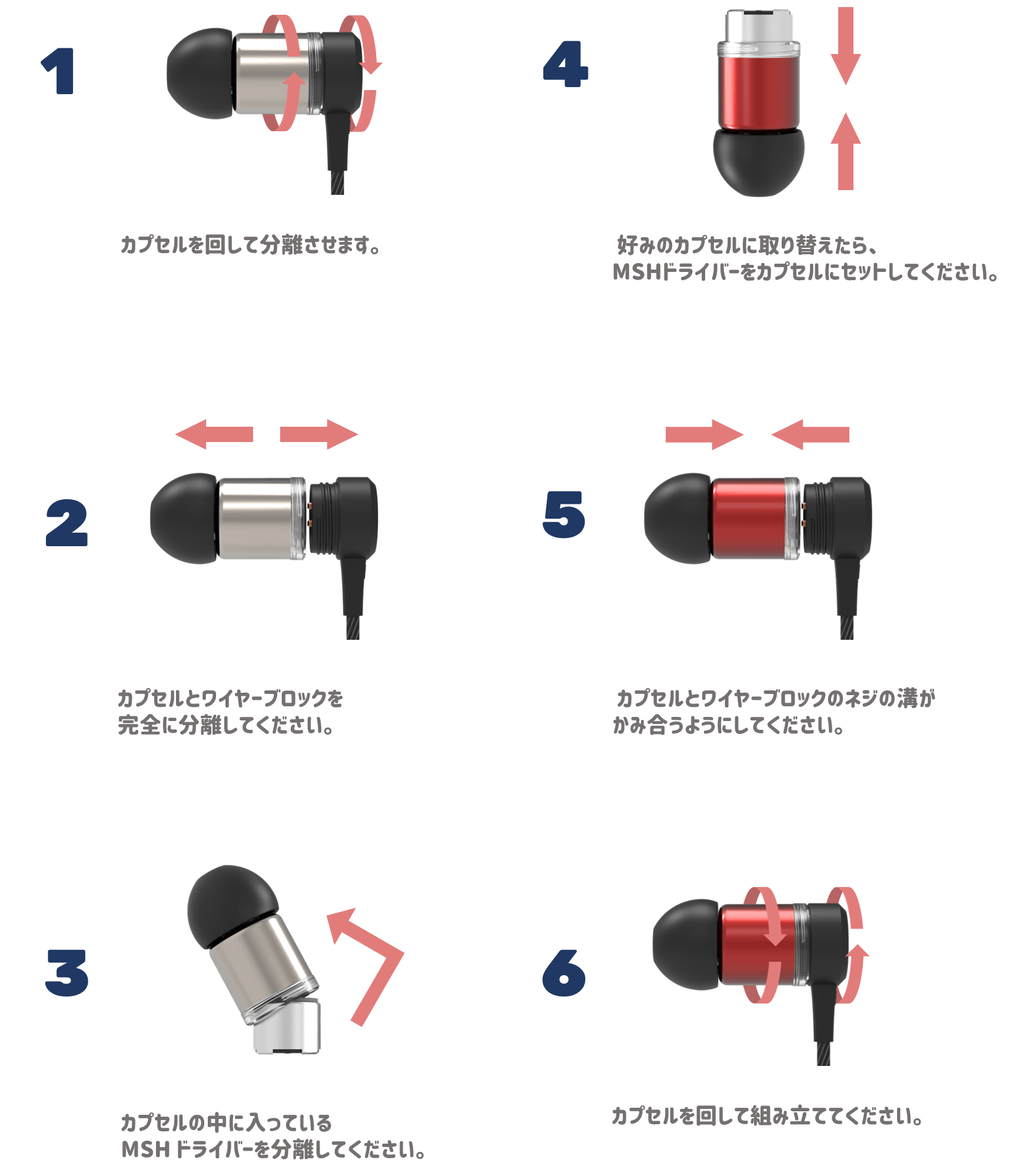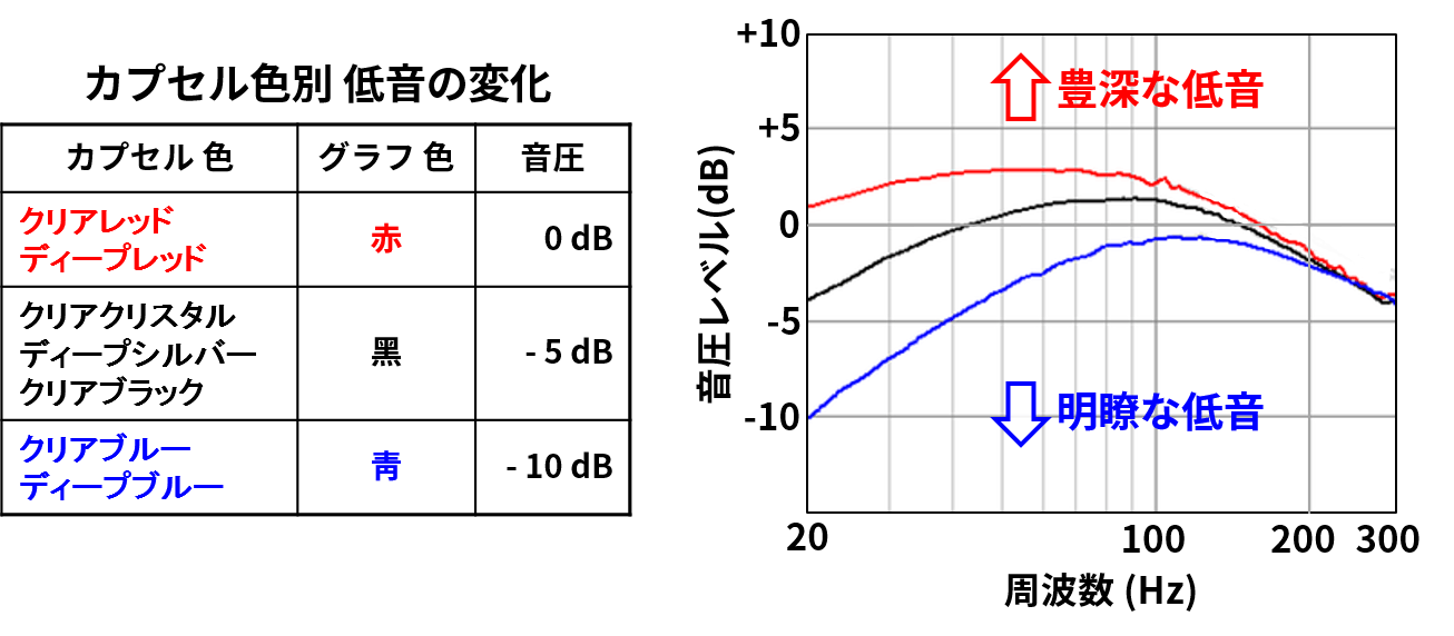 - 2つのタイプの MSH ドライバー、3種類のクリアカプセル、 3種類のハイブリッドカプセルを組み合わせて、全部で12種類のサウンドパターンに組み換え可能です。