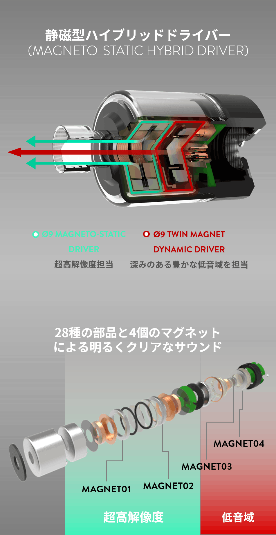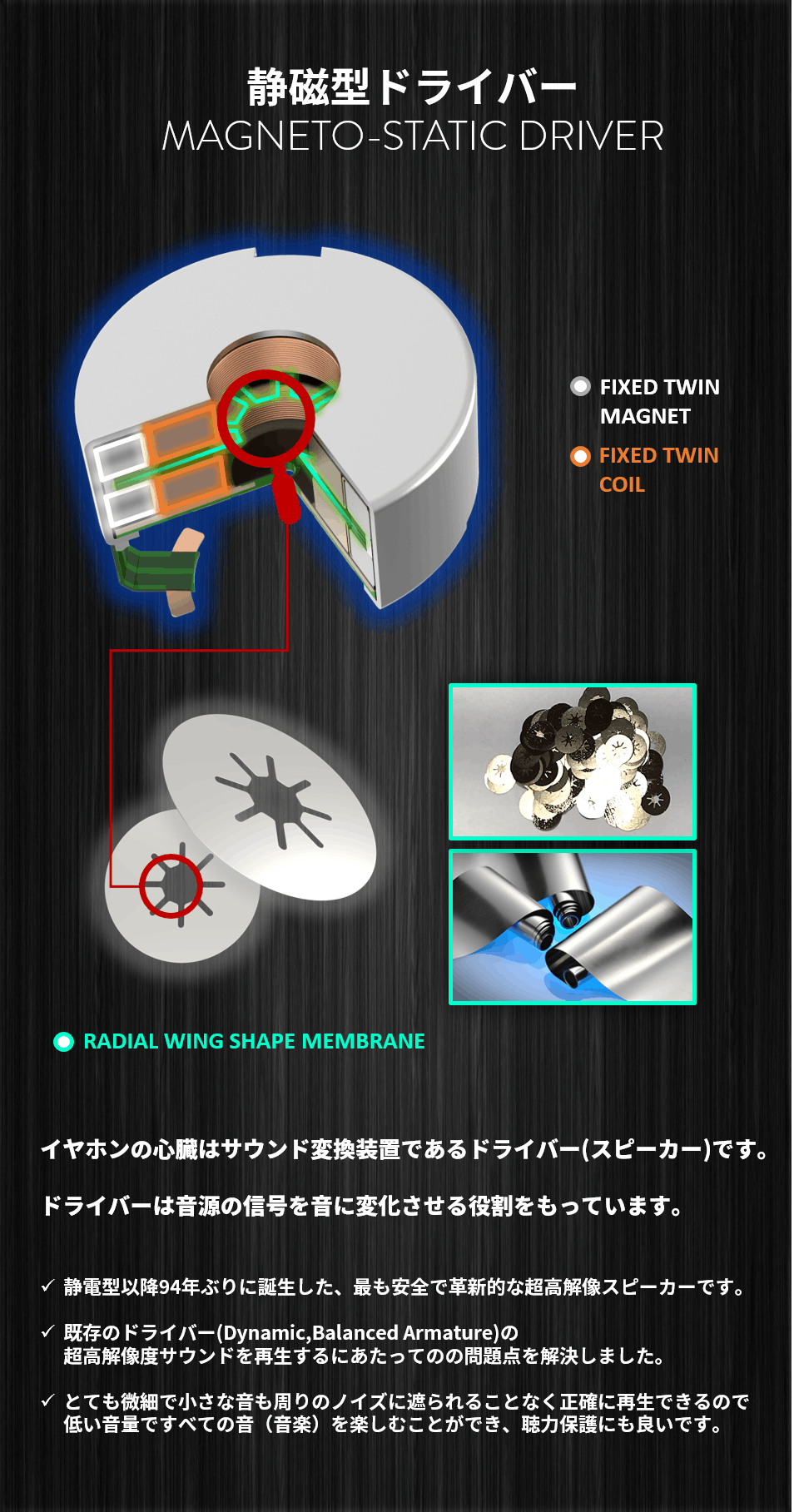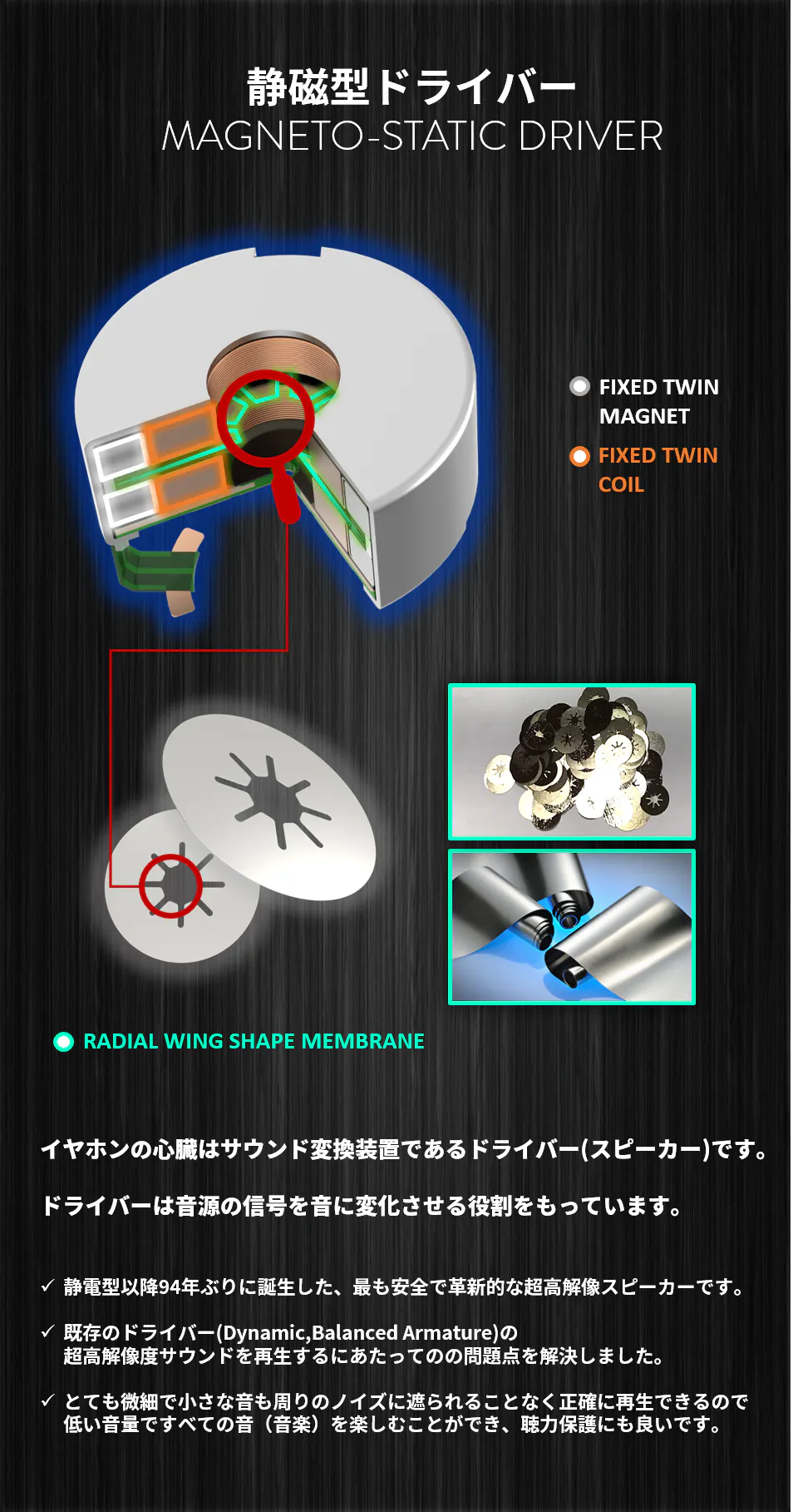 世界初の技術「静磁型構造 (Magneto-Static Method)」により、静電型 (ElectroStatic) イヤホンと同等の超高解像度サウンドを実現しました。
