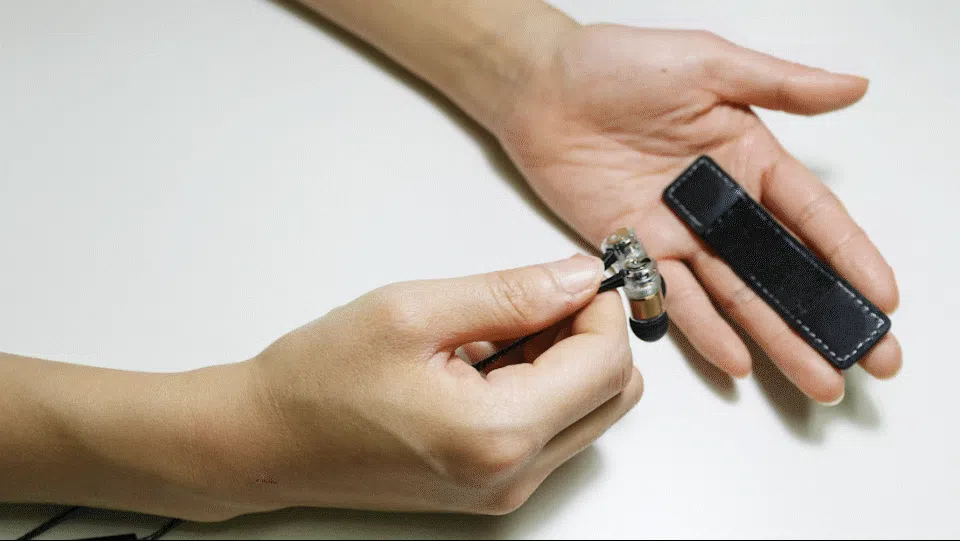 HPSD E70 のパッケージにはイヤホンの管理が楽になるマグネット内蔵のレザーストラップが含まれています。